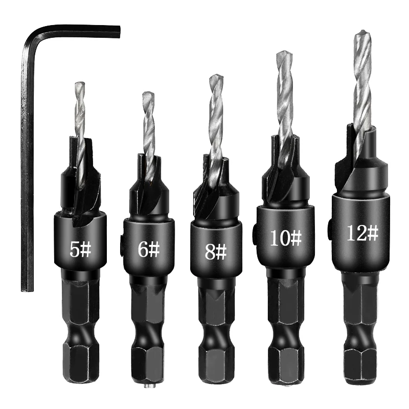 Набор из пяти частей включает биты для сверления пилотных отверстий для размеров винтов № 5, № 6, № 8, № 10 и № 12
