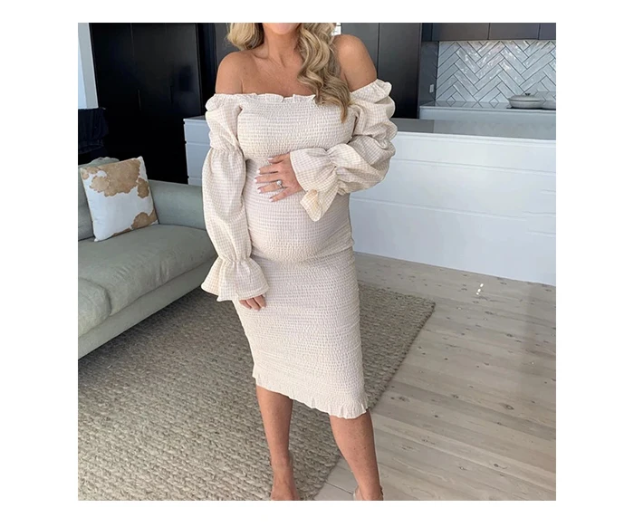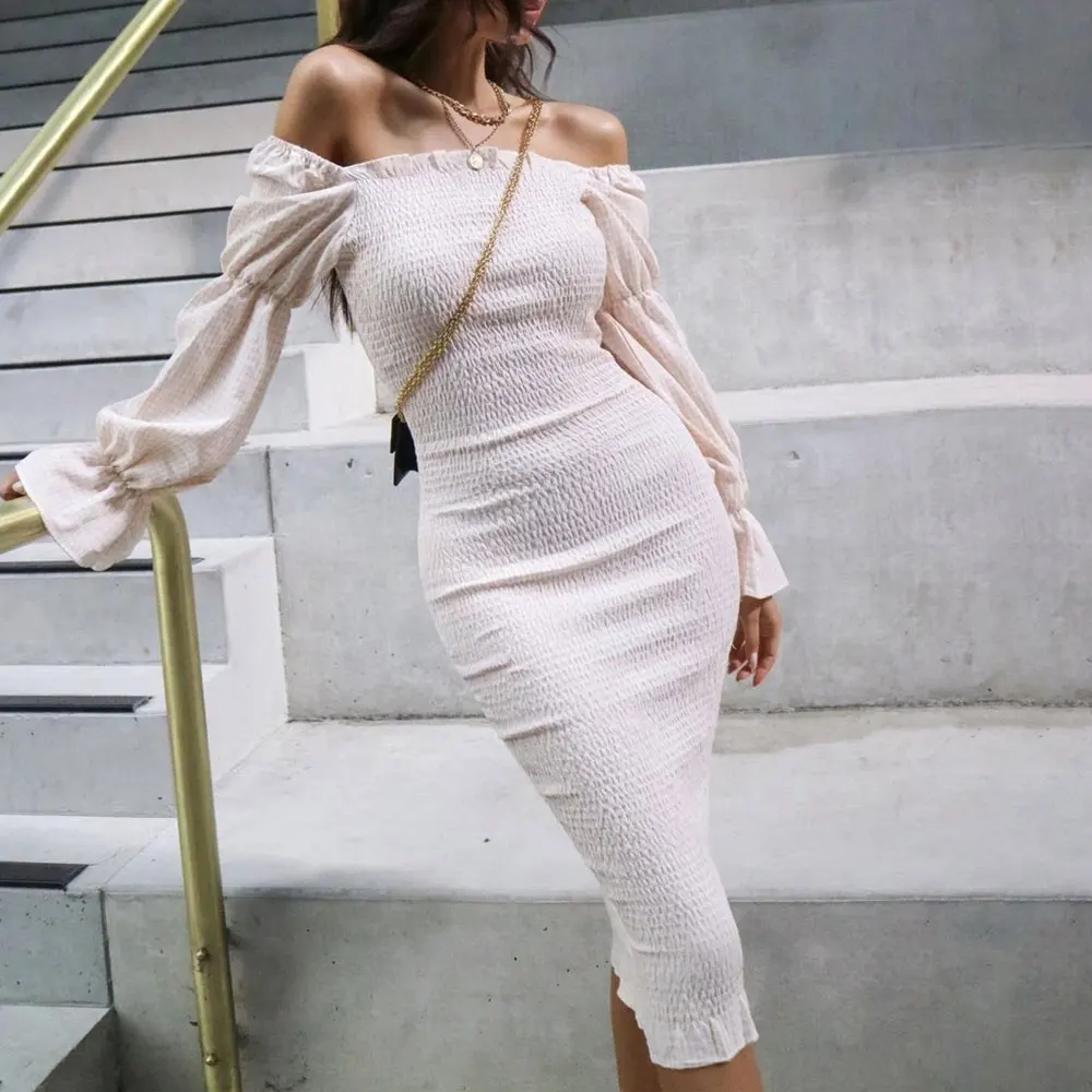 Платье женское эластичное с оборками, элегантное однотонное шифоновое облегающее вечернее средней длины, с открытыми плечами и длинным рукавом, весна-лето 2020
