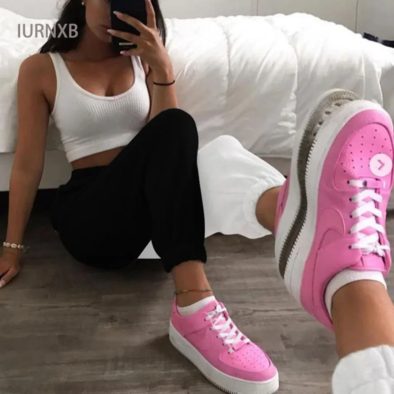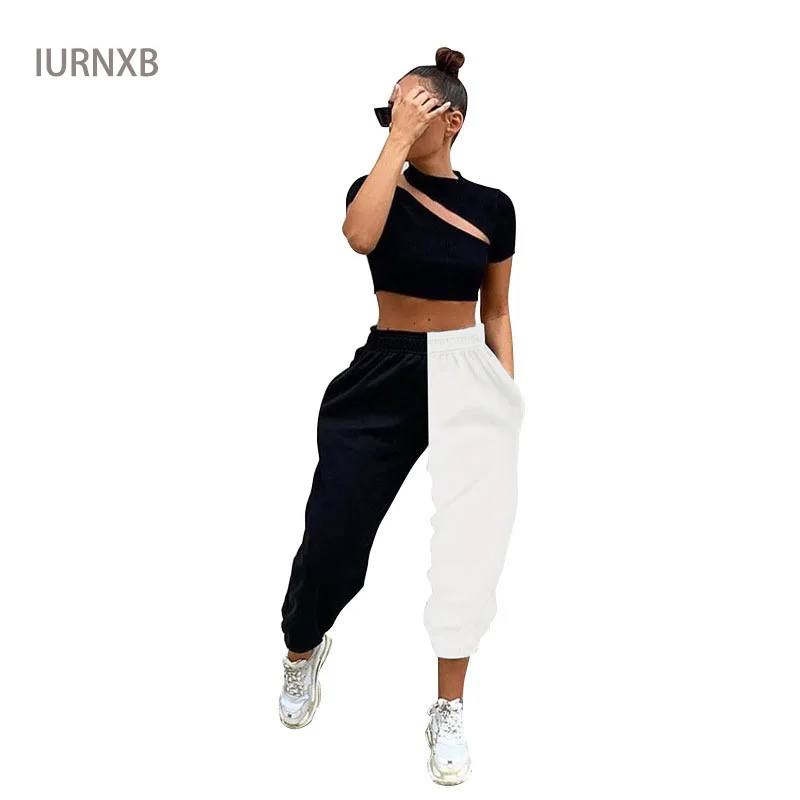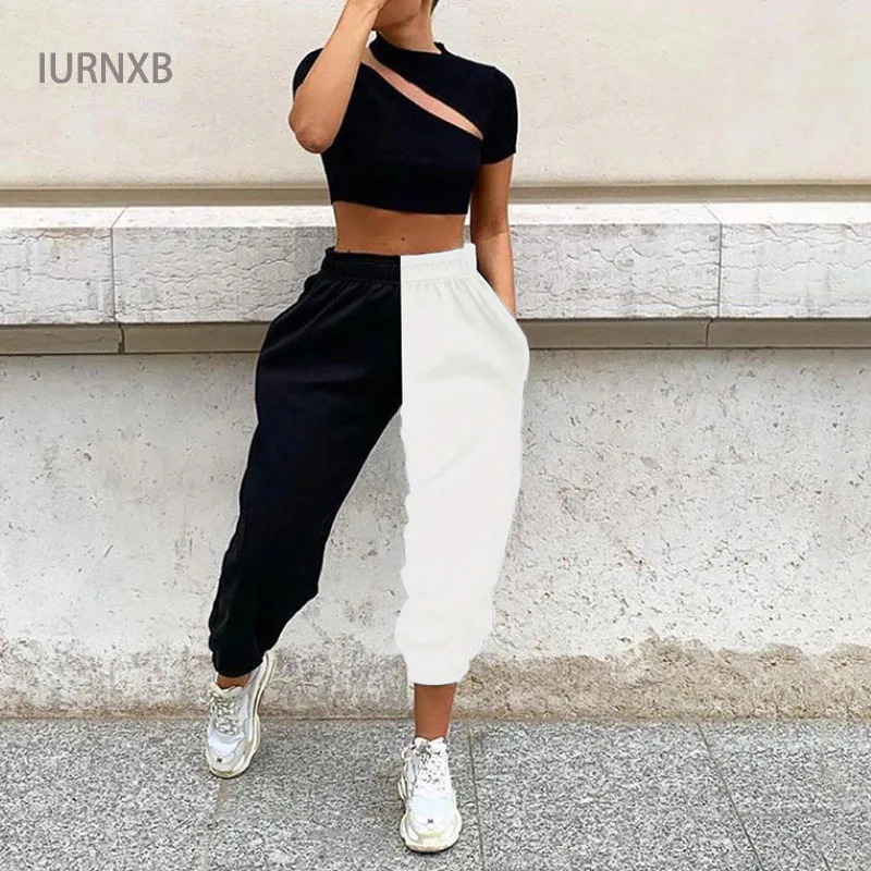 Брюки женские для фитнеса с высокой талией, свободные спортивные штаны контрастных цветов с прострочкой, черные белые