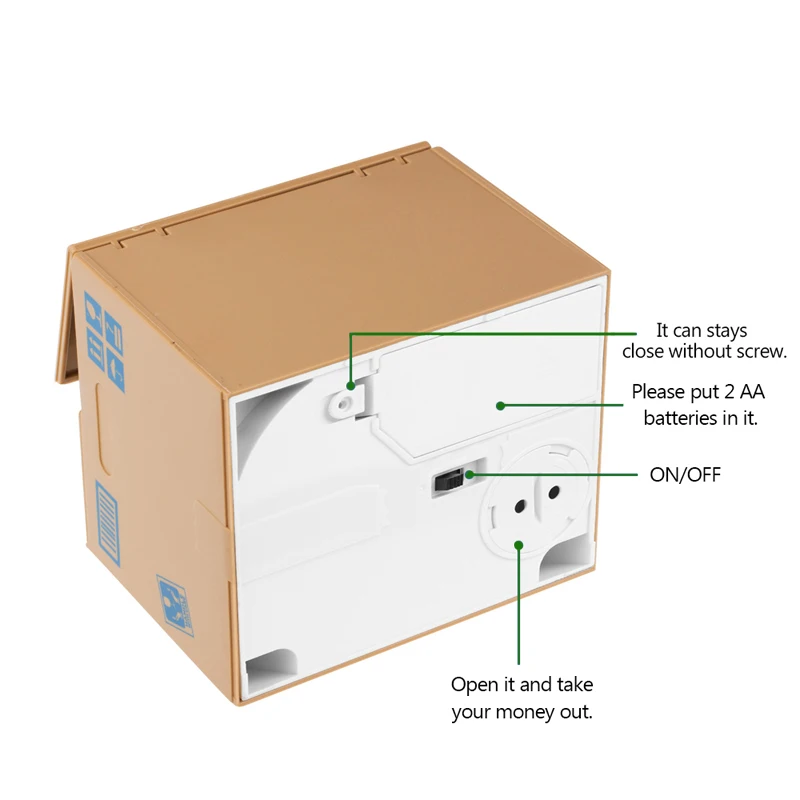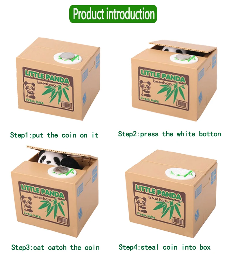 Мультяшная панда, копилка, кошка, кража, копилка, автоматическая копилка для монет, копилка, копилка, подарок на день рождения для детей Как работать? Шаг 1: Поместите две батарейки AA (не входят в комплект) в нижний паз Шаг 2: Поместите монету в белую кнопку и нажмите на нее, кот поймает ее в ящик. Шаг 3: Откройте дно и выньте монету.