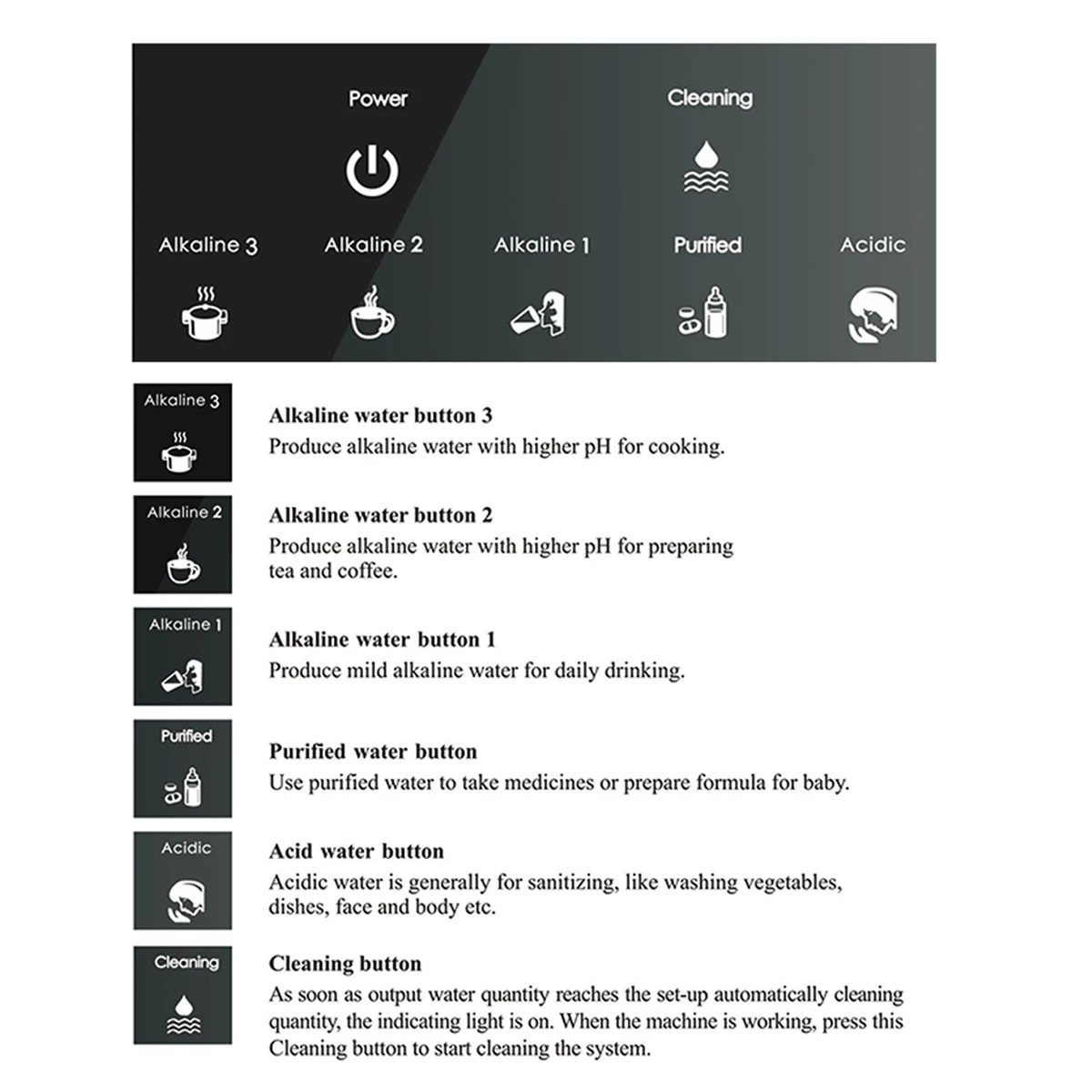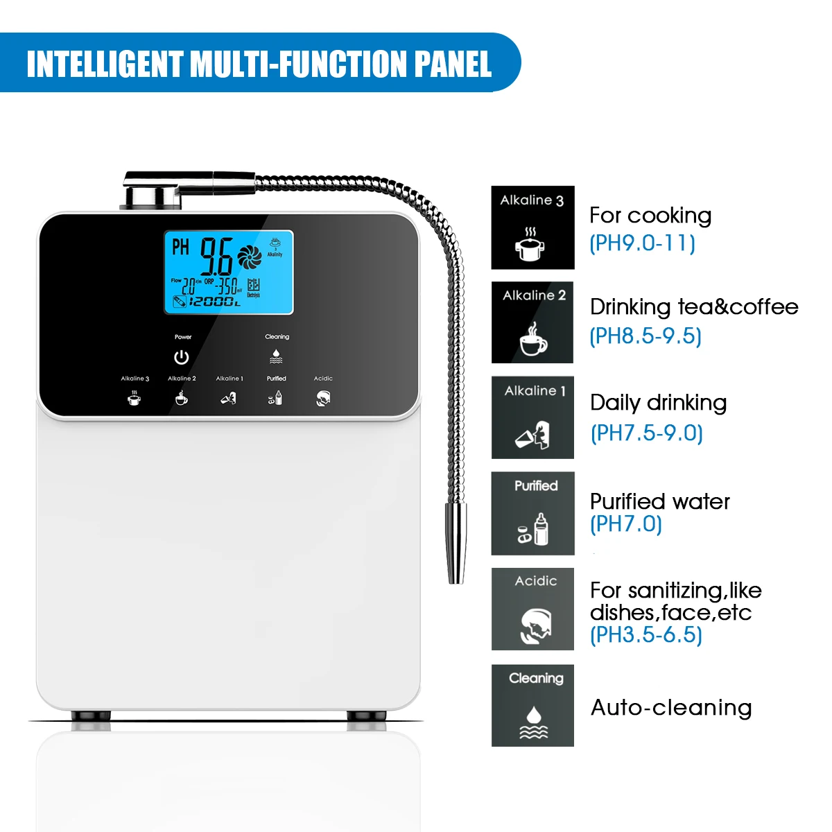 1. ЖК-дисплей отображает pH и ОВП, расход, температуру, срок службы фильтров, помогая пользователю выбрать подходящую воду. 2. Используя мощный источник питания SMPS, он подходит для множества различных источников питания в мире, безопасный и надежный. 3. Электролиз с микрокомпьютерной автоматической системой управления может отлично работать в воде TDS от 50 до 1200PPM 4. Он имеет встроенную систему фильтрации воды, показывающую длительный срок службы фильтра, чтобы убедиться, что качество воды безопасно в использовании. 5. Имеет функцию самоочистки для предотвращения накипи. 6. Япония импортировала носики из нержавеющей стали, никогда не ржавеют, свободно сгибаются в любом направлении. 7. Титановые пластины с платиновым покрытием, 11 шт., нанесенные с импортной японской ионной емкостью, обеспечивают более высокую эффективность электролиза и более длительный срок службы.