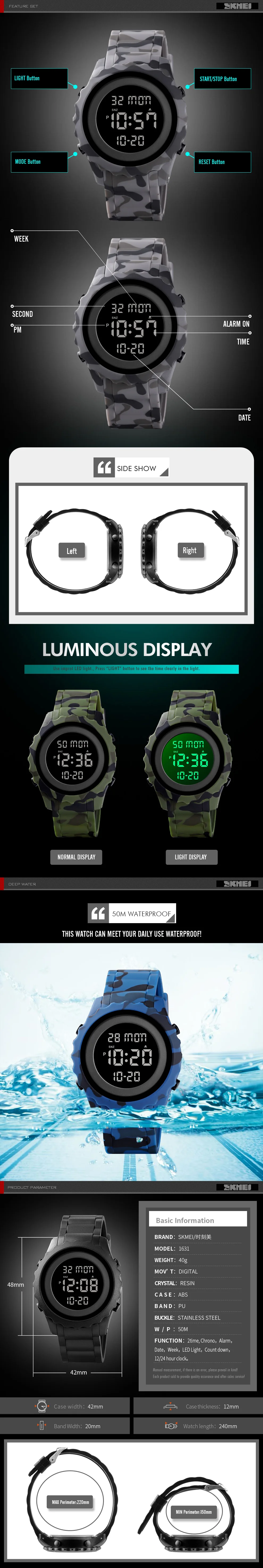 SKMEI спортивные часы Модные Военные часы для мальчиков светодиодный светильник часы отсчет хронограф цифровые часы для мужчин 50 м водонепроницаемые