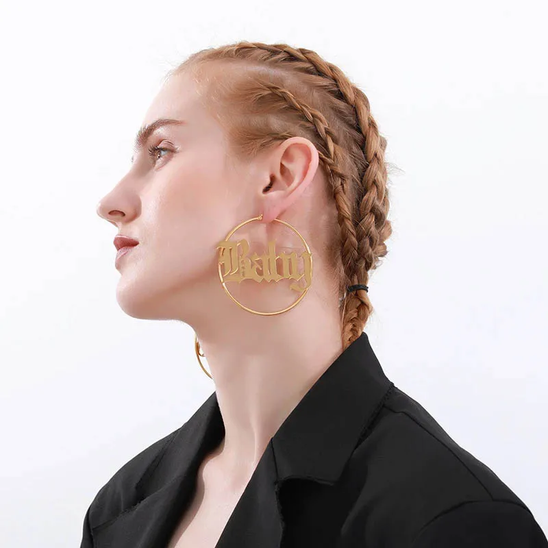 Большие серьги-кольца из нержавеющей стали для женщин, персонализированные ювелирные изделия 70 мм, розовое золото, Старое Английское имя, серьги Brinco