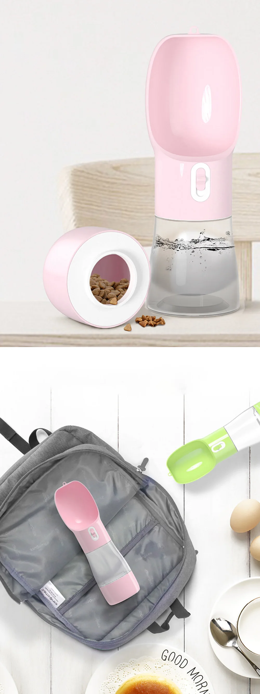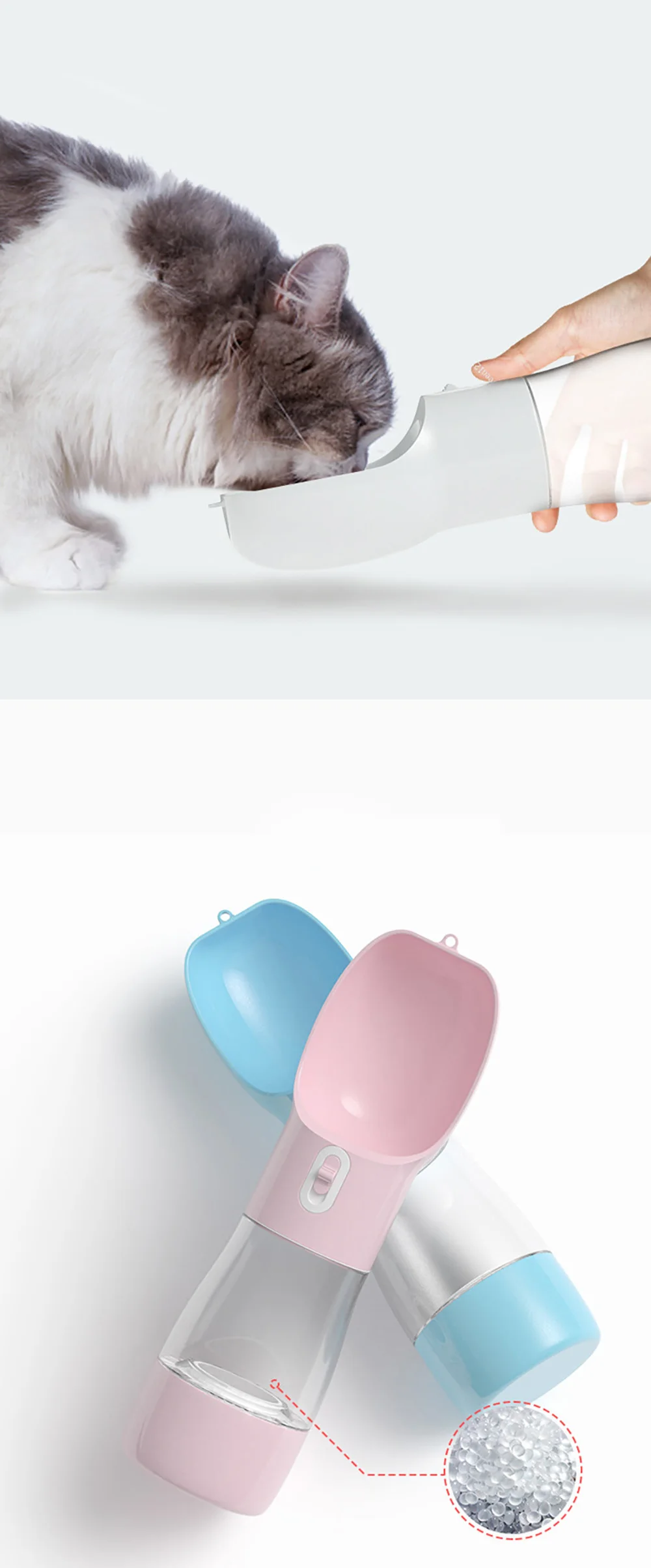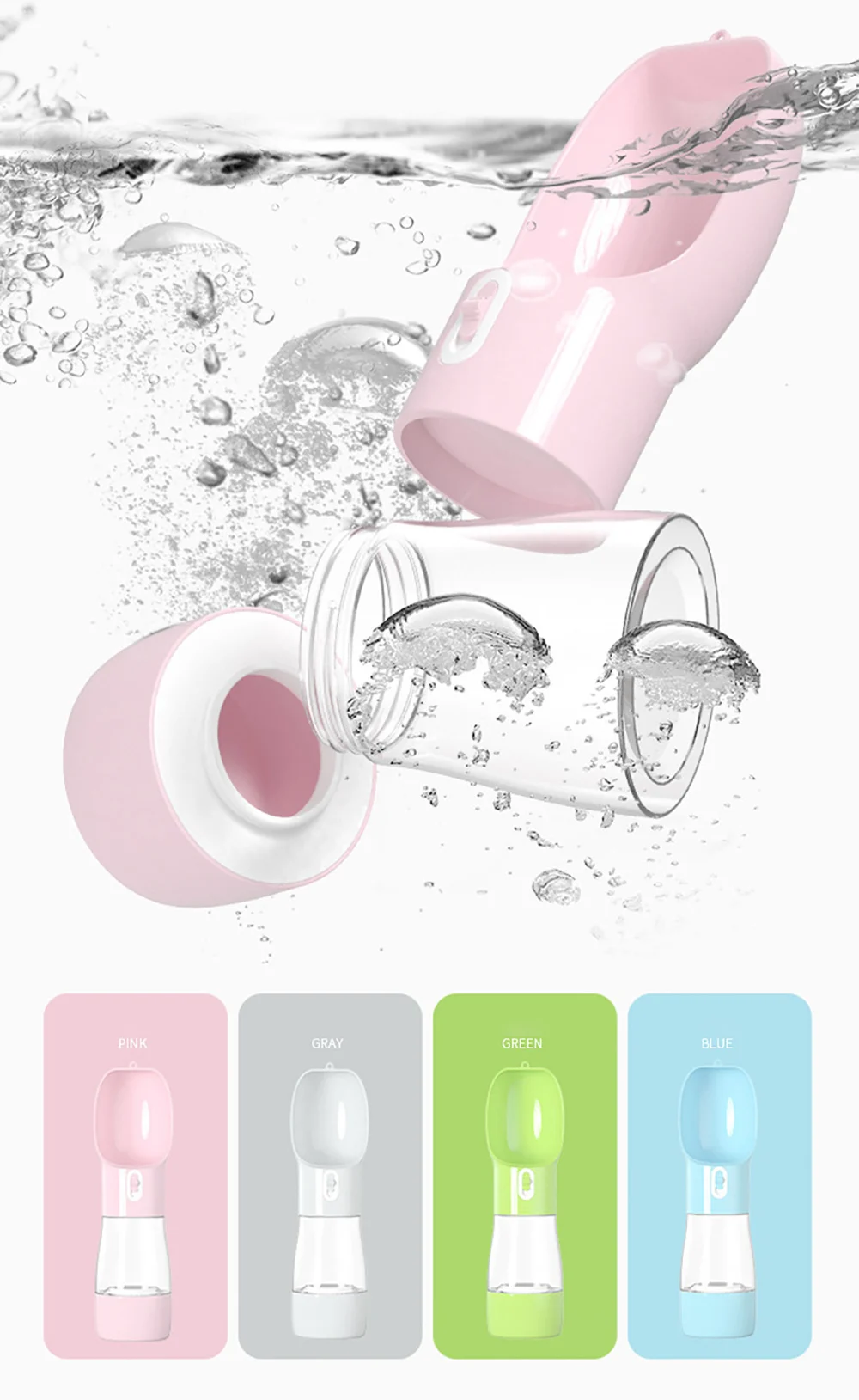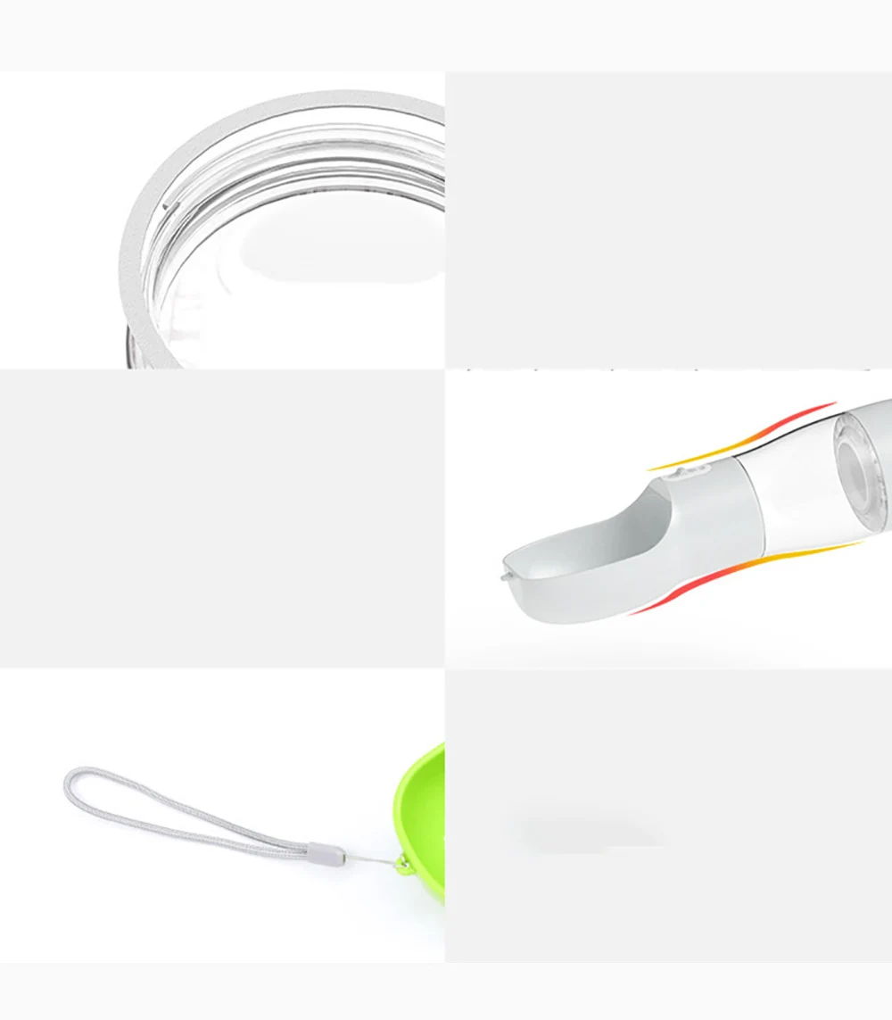 1. Подача воды + комбинация кормления, одна бутылка Для двойного использования. 2. Переключатель удобен и безопасен и отказывается Утечка. 3. Экологически чистые материалы для защиты домашних животных Здоровье. 4. Бутылка термостойкая и может согревать Вода. 5. Маленький и удобный для переноски, можно использовать с помощью одного Рука. 6. Емкость: 258 мл воды + 200 г еды.