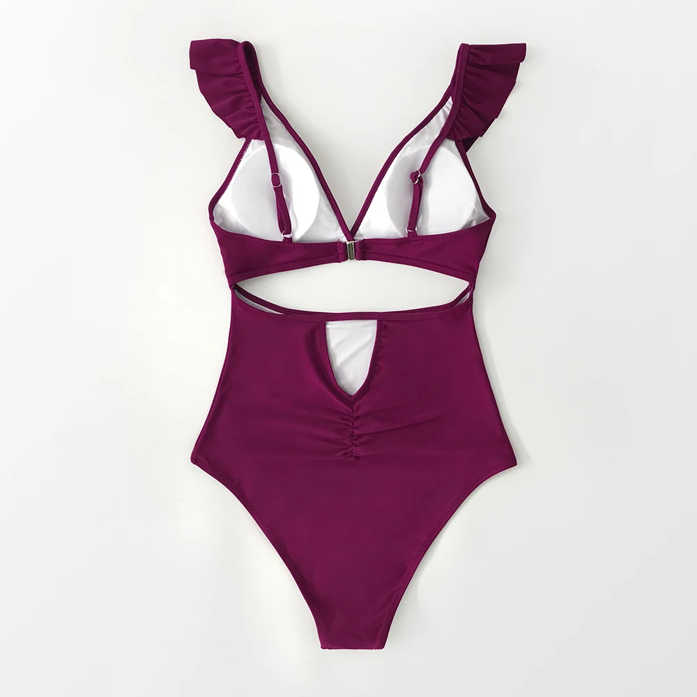 Почувствуйте себя лучше всего в сплошном бордовом слитном купальнике с V-образным вырезом и оборками, этот привлекательный по фигуре купальный костюм с женственными оборками и вырезами, которые вам понравятся. Регулируемые лямки обеспечивают идеальную посадку. Полый элемент выше бедер позволяет вам выглядеть очень сексуально