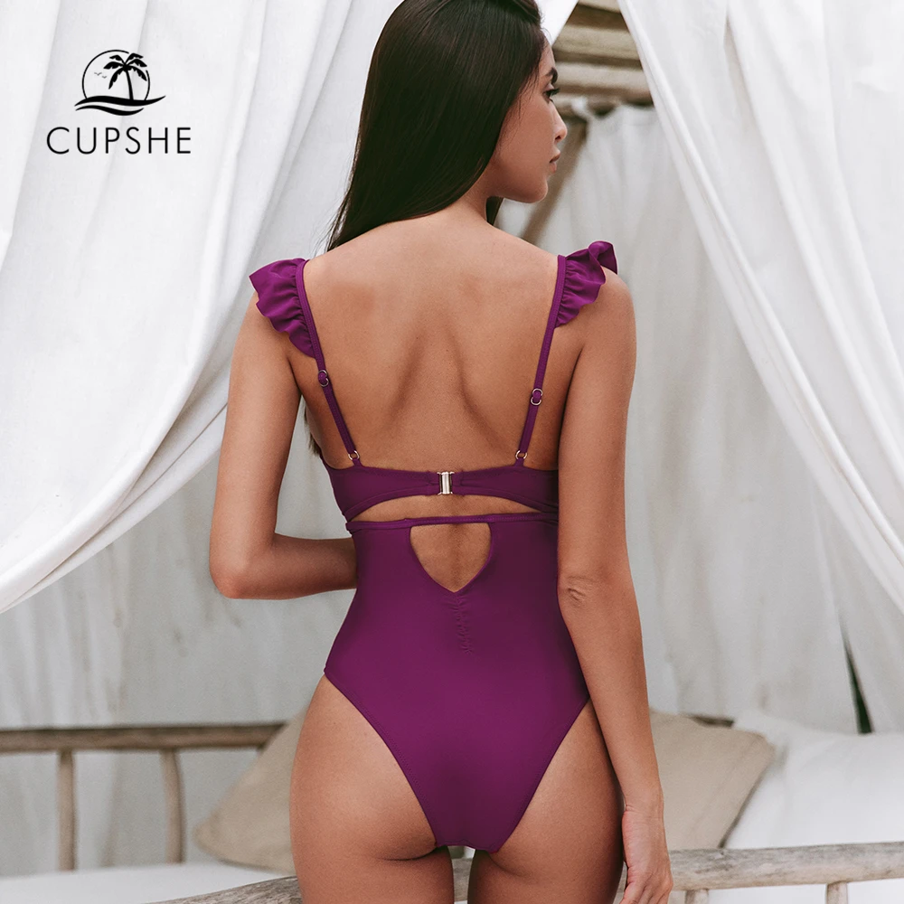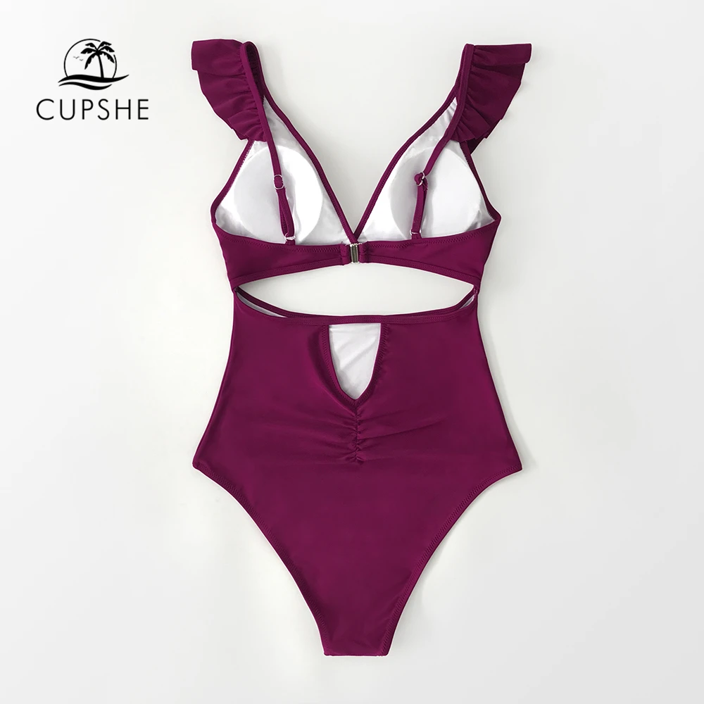 CUPSHE однотонный бордовый купальник с оборками и v-образным вырезом, сексуальный купальник с вырезами, чашечки с подкладкой, Женский Монокини, 2022, пляжный купальный костюм, купальник
