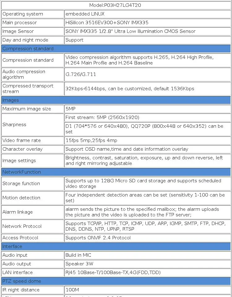 Ip-камера 5 Мп PTZ принимает высокоинтегрированный процессор SOC Hi3516EV300, чрезвычайно низкое энергопотребление и сильная стабильность; Поддерживает алгоритм сжатия H.265 для обеспечения качества изображения, эффективно сокращая пропускную способность сети; Мощная сетевая функция, поддержка стандартного протокола ONVIF, Поддержка RTSP, поддержка загрузки изображения сигнала тревоги FTP сервер, изображение тревоги на электронную почту, Поддерживает мобильный телефон с дистанционным мониторингом;