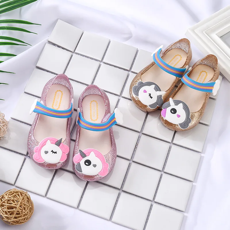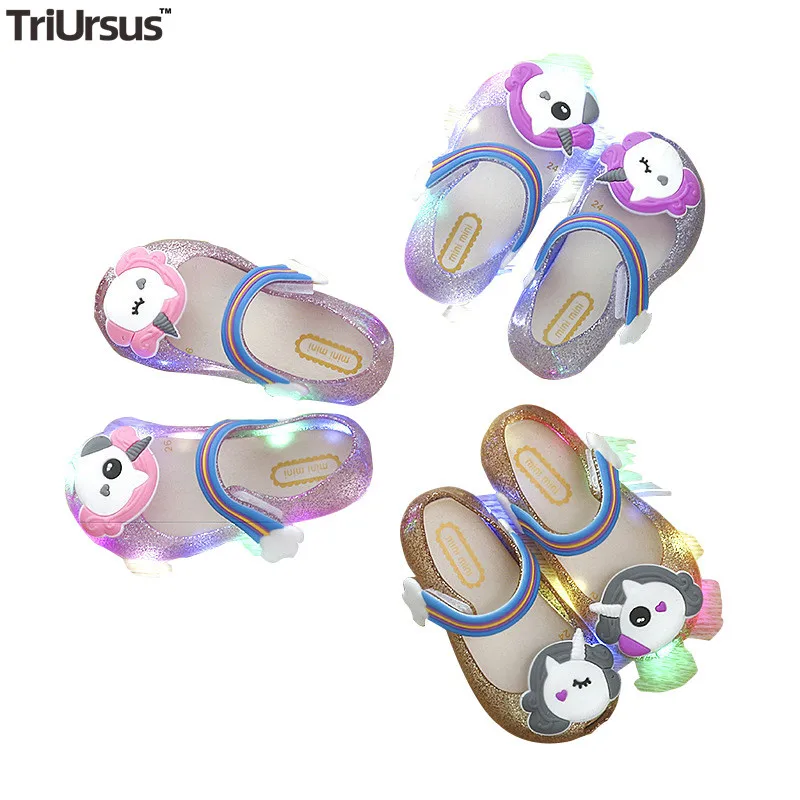 Сандалии для девочек, новинка 2020, детская обувь со светодиодами, летние сандалии для маленьких девочек, светящиеся сандалии с бантиком и единорогом, детские сандалии-желе для девочек на плоской подошве