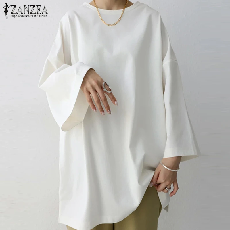 Женская мешковатая однотонная блузка ZANZEA 2021, винтажные топы с расклешенными рукавами, повседневные осенние блузы, Женская туника с разрезом, рубашка большого размера