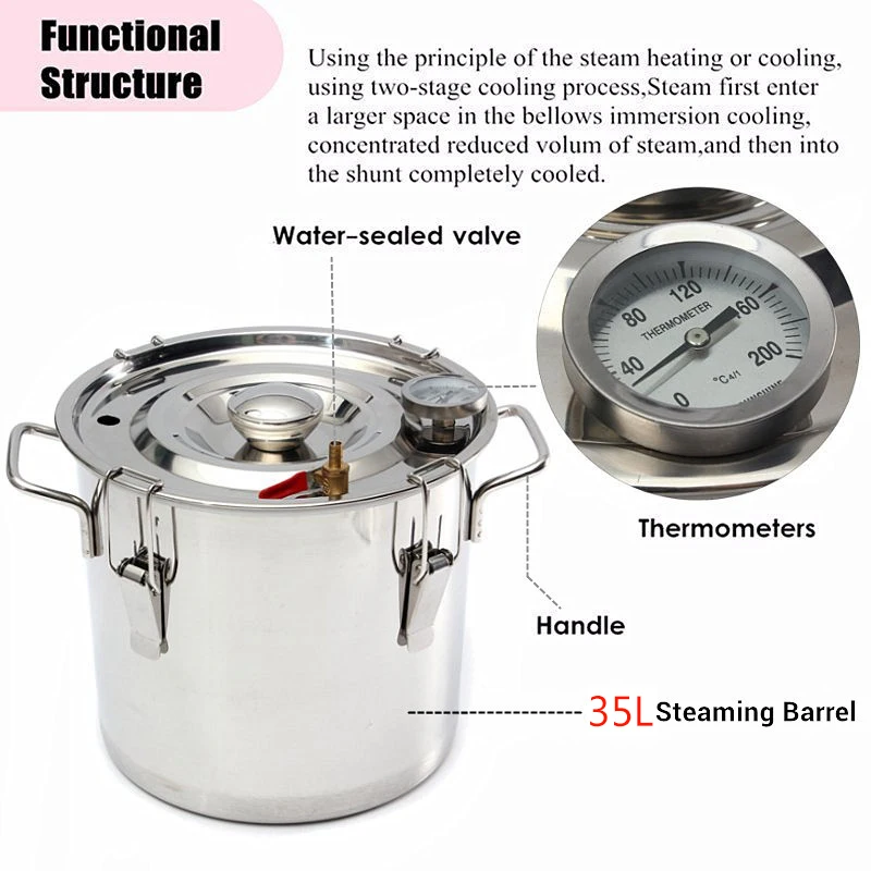 Функция:-Этот набор домашнего дистиллятора-это полный набор для производства вина. Его очень легко настроить и использовать, он особенно подходит для производства духов с сильным ароматом (бренди, виски, фруктовый бренди, Ecc.), также для эфирных масел (ароматов, средств и ликеров), но особенно для высококлассного спирта (водки). Также можно сделать чистую воду.Технические характеристики:-Сварка: изделие сварено аргоном, чтобы избежать каких-либо проблем со здоровьем, связанных с сваркой и пайкой, построенными спиртовыми сваями.-Материал охлаждения: медь высшего сорта;-Размер: 35 л-Размер бойлера 35 см в диаметре x 35 см в высоту, молоток keg Размер 20 см в диаметре x 13 см в высотуПосылка включает в себя:1 х чайник из нержавеющей стали1 х молоток keg1 набор необходимых аксессуаров (выпускной клапан, силиконовый шланг, прокладки и прокладки, полные аксессуары, как показано на фотографии)