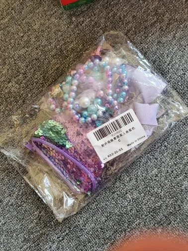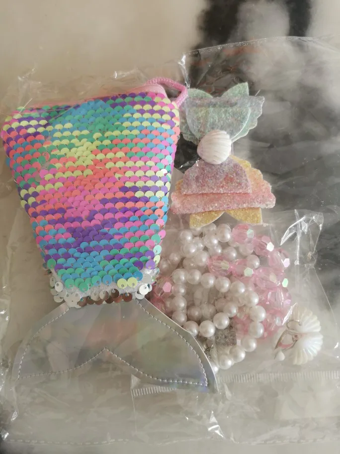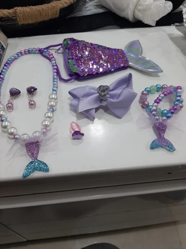 чудесный комплект, пришел относительно быстро- около 3 недель до СПб. сумочка маленькая, все добро, кроме банта, туда с трудом помещается. Во время примерки пока ничего не развалилось, клипсы мягкие, вроде давят не сильно пайетки зелёные, отличаются от цвета бус и хвостиков, но это, скорее, моя печаль, дочке точно все равно) но звезды 4 в подарок наклейки)