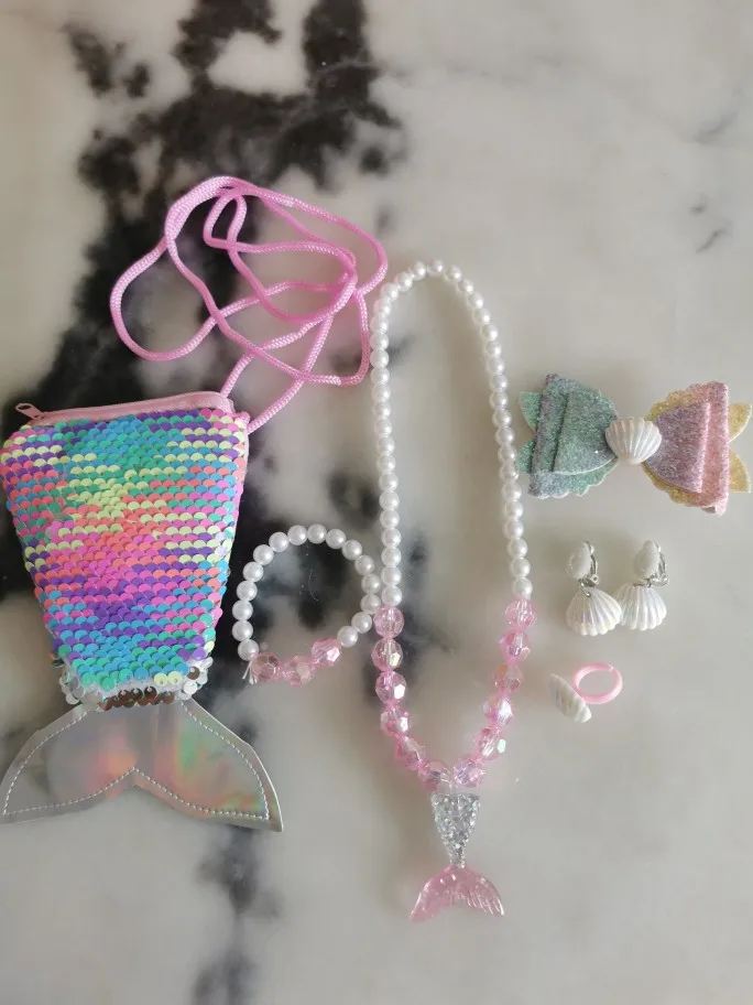 Набор ювелирных изделий, с блестками, кошельком, ожерельем, браслетом, бантом, зажимом для волос, серьги-ракушки, подарок для принцессы Эльзы, для девочек