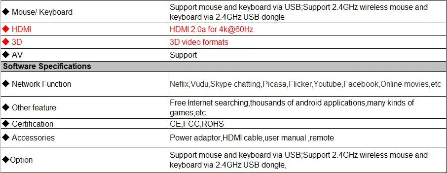 1. Четырехъядерный процессор Rockchip RK3318 64 бит Cortex-A53;2. GPU: Penta-Core Mali-450;3. ОС Android 10,0;4. Поддержка H.265, 4K 60pfs, HD 2,0, USB3.0,USB2.0;5. Поддержка 10/100M Ethernet, 2,4G и 5G двухъядерный процессор Wi-Fi; BT4.06. Поддержка обновления прошивки онлайн (OTA). 7. Есть 4 варианта коробки для RBOX-R1 HK1:A: 2 Гб + 16 ГБ + 2,4G & 5G, Wi-Fi + BT4.0B: 4 Гб + 32 ГБ + 2,4G & 5G, Wi-Fi + BT4.0C: 4 Гб + 64 ГБ + 2,4G & 5G, Wi-Fi + BT4.0D. 4 Гб + 128 ГБ + 2,4G & 5G, Wi-Fi + BT4.0