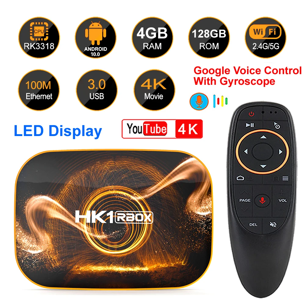 Приставка Смарт-ТВ HK1 RBOX R1, Android 10, Rockchip RK3318, 4 + 128 ГБ, Bluetooth, 4K 3D