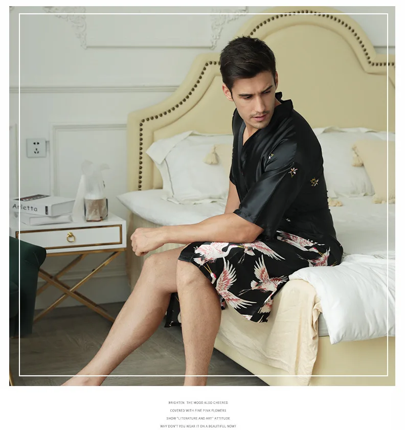 Мужское интимное белье, Шелковый черный халат для шафера, повседневное кимоно, халат, атласная ночная рубашка с принтом, домашняя одежда, сексуальная пижама