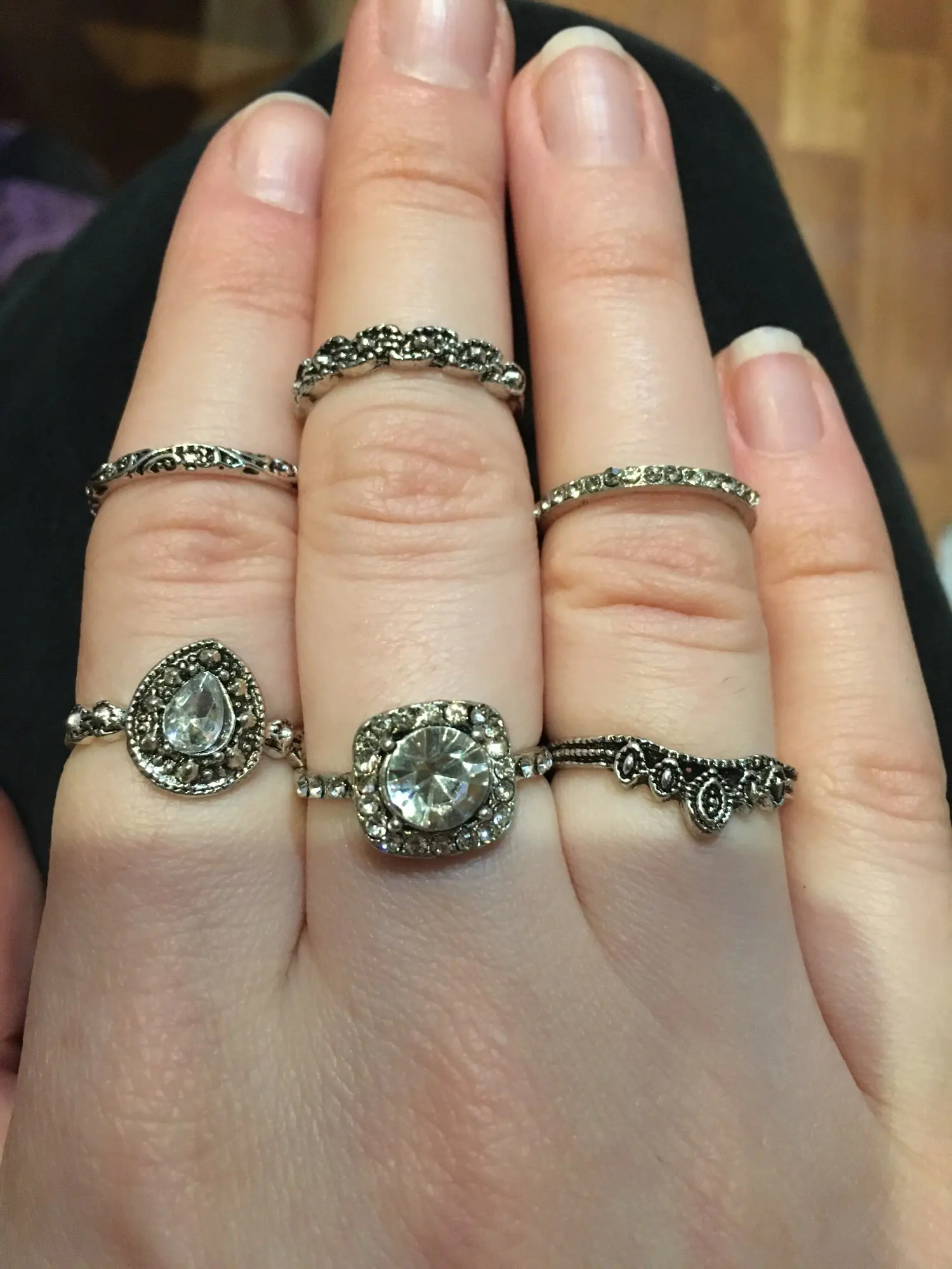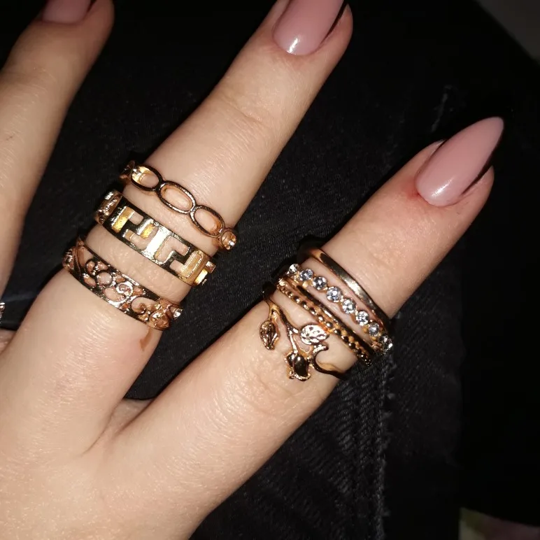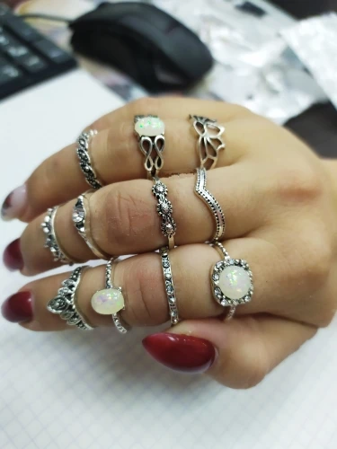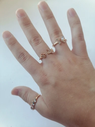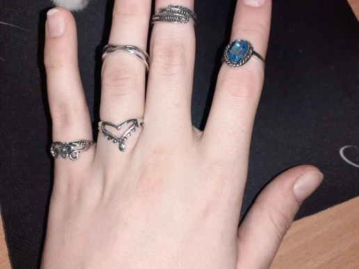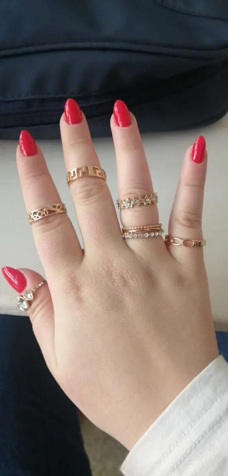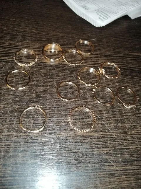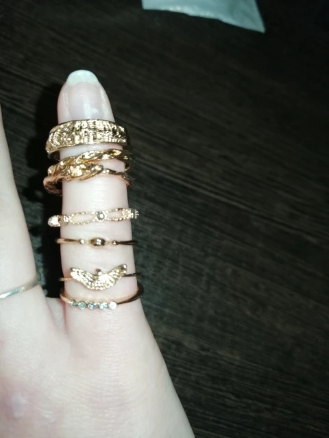 По картинкам было непонятно, какой размер у колец. Размер моего указательного пальца 16,5. В данном комплекте имеются 5 одинаковых колец (вам на заметку). На 3 фото можно заметить 2 кольца, которые разочаровали, они немного кривые и неровно вырезан металл, у кольца с камнями нет одного камня. На некоторых кольцах из комплекта видны изъяны: вдавленности и маленькие царапины. С продавцом не приходилось связываться, он отправил заказ быстро, буквально на следующий день после оплаты. Посылка пришла за 2 недели в Москву. В целом, если сопоставлять цена-качество, то можно сказать, что всё хорошо.