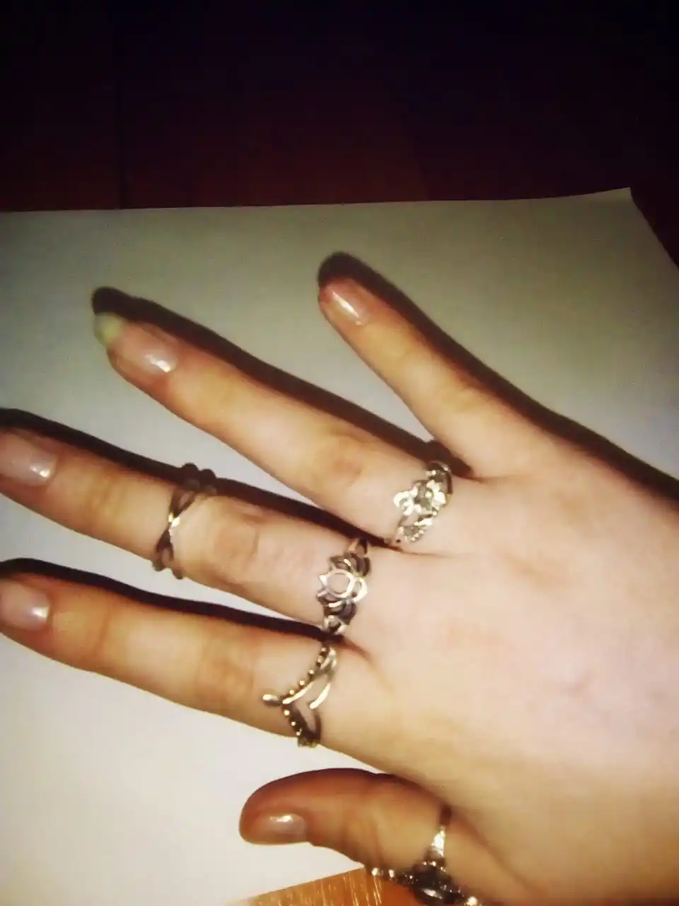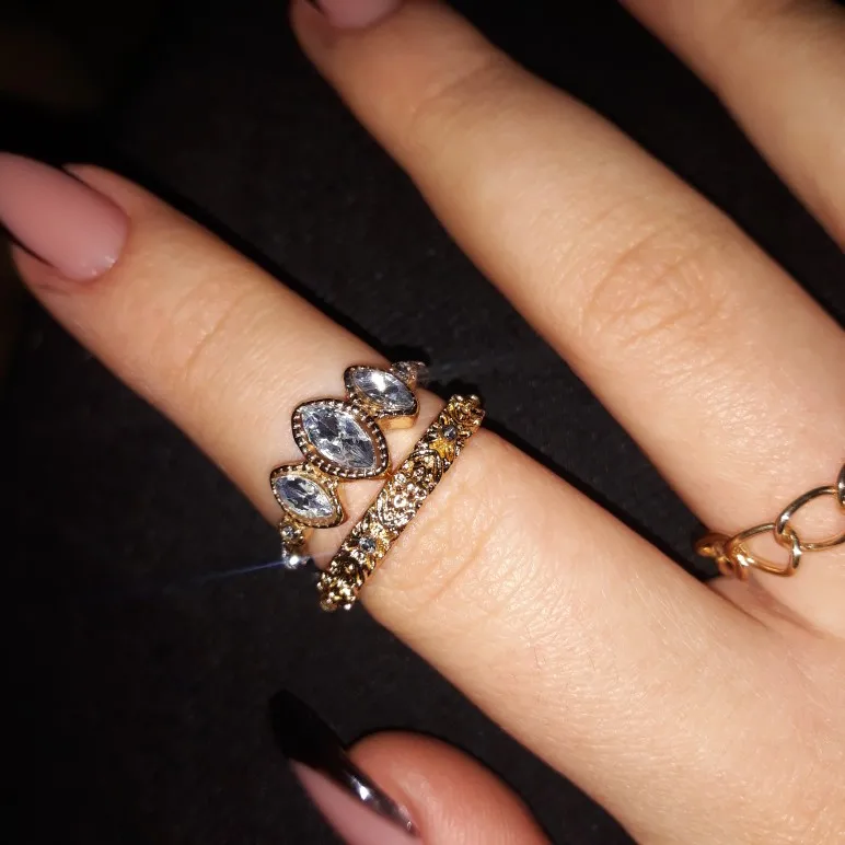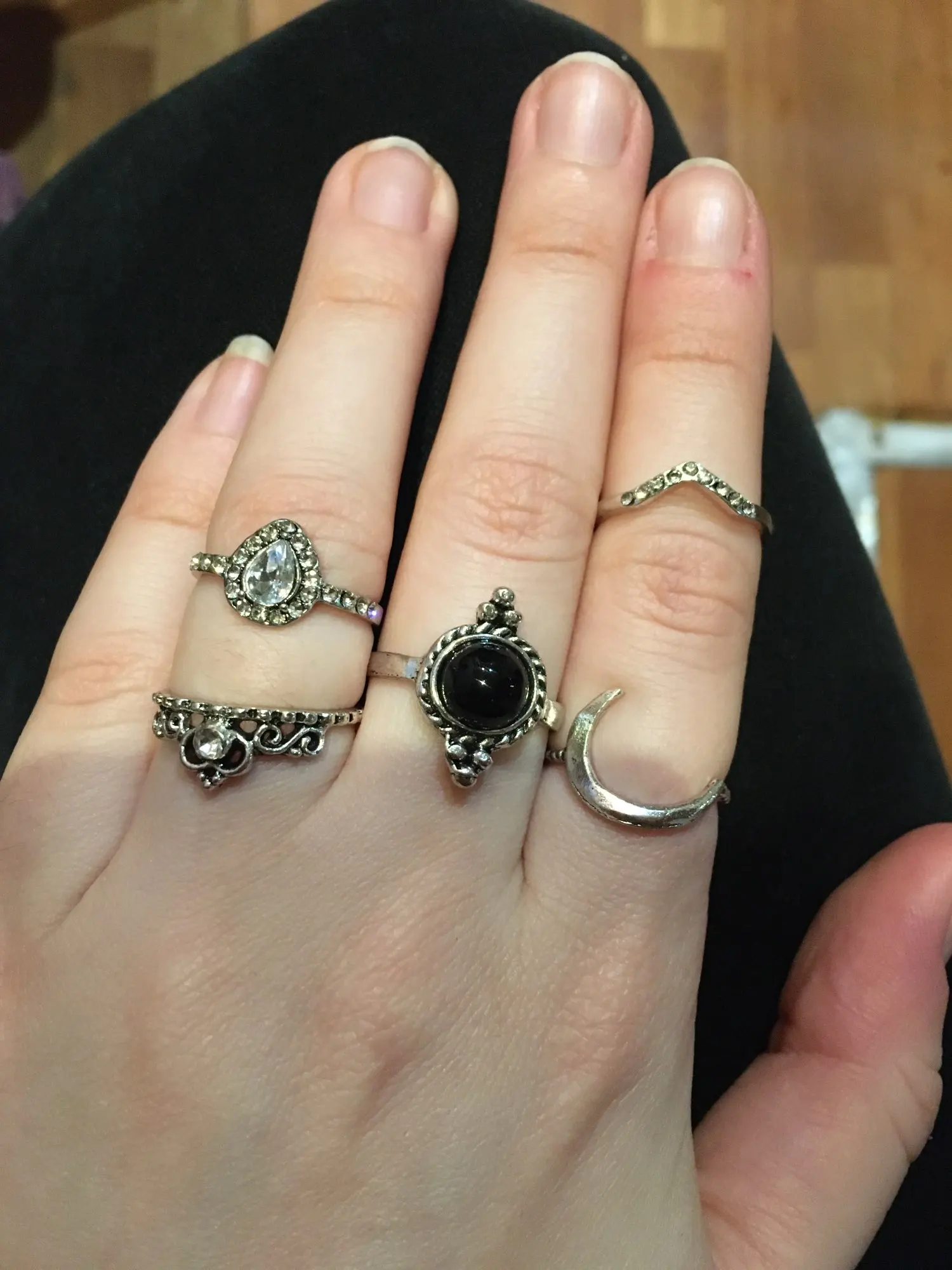 По картинкам было непонятно, какой размер у колец. Размер моего указательного пальца 16,5. В данном комплекте имеются 5 одинаковых колец (вам на заметку). На 3 фото можно заметить 2 кольца, которые разочаровали, они немного кривые и неровно вырезан металл, у кольца с камнями нет одного камня. На некоторых кольцах из комплекта видны изъяны: вдавленности и маленькие царапины. С продавцом не приходилось связываться, он отправил заказ быстро, буквально на следующий день после оплаты. Посылка пришла за 2 недели в Москву. В целом, если сопоставлять цена-качество, то можно сказать, что всё хорошо.