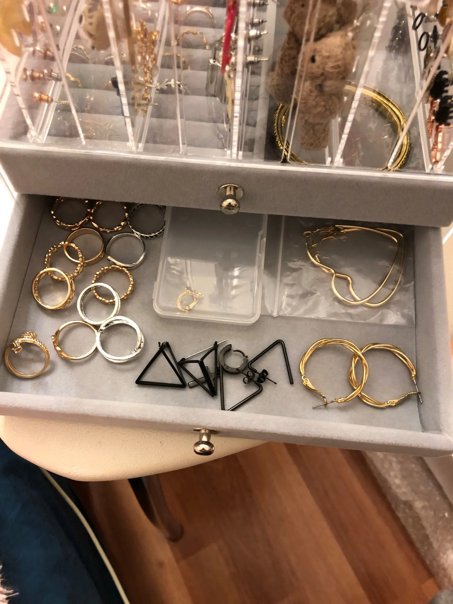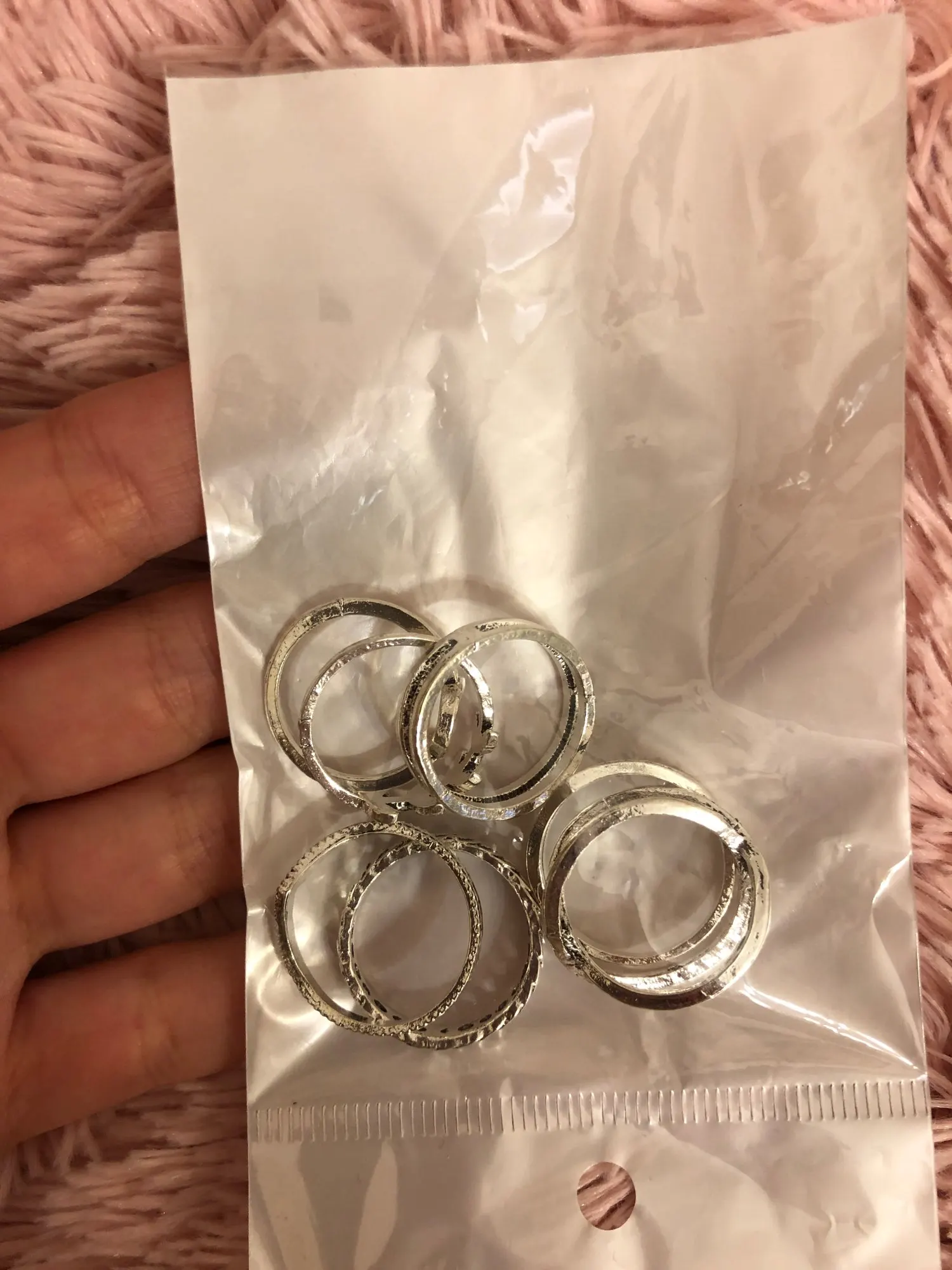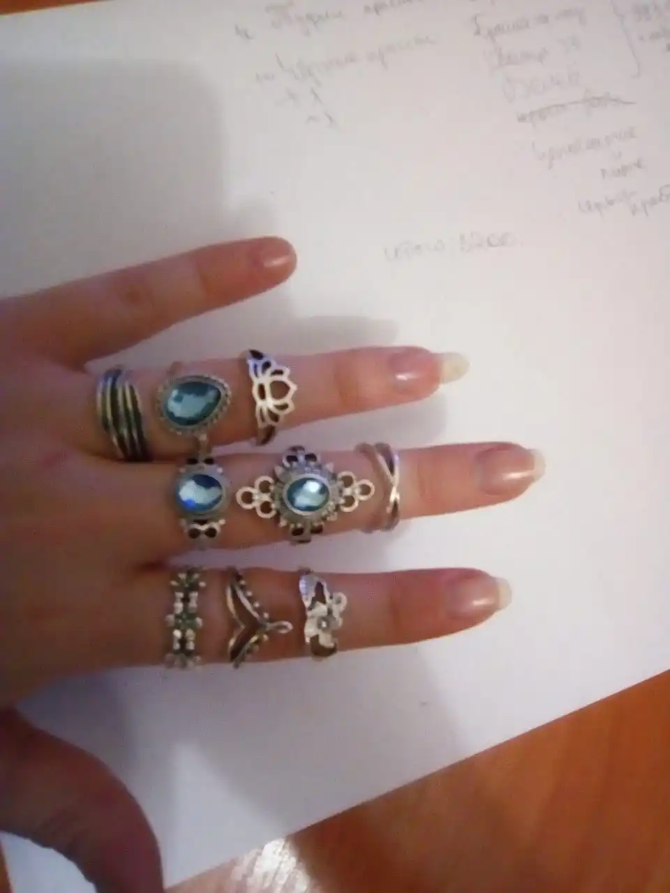 Заказывала сразу два комплекта, дошло меньше, чем за месяц, запаковано отлично! Некоторые кольца мне прям очень большие (даже на большой палец), но я что нибудь с этим придумаю. Очень удобно, что все мелкие заказы собрали в один пакет
