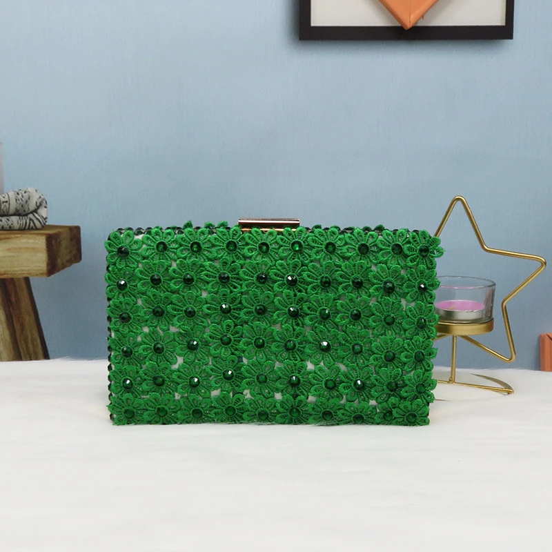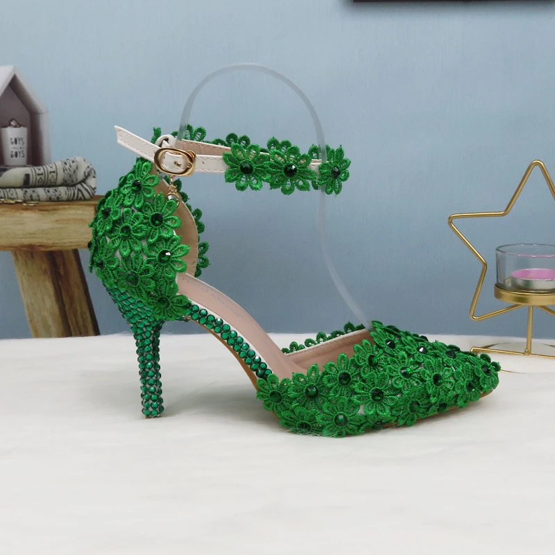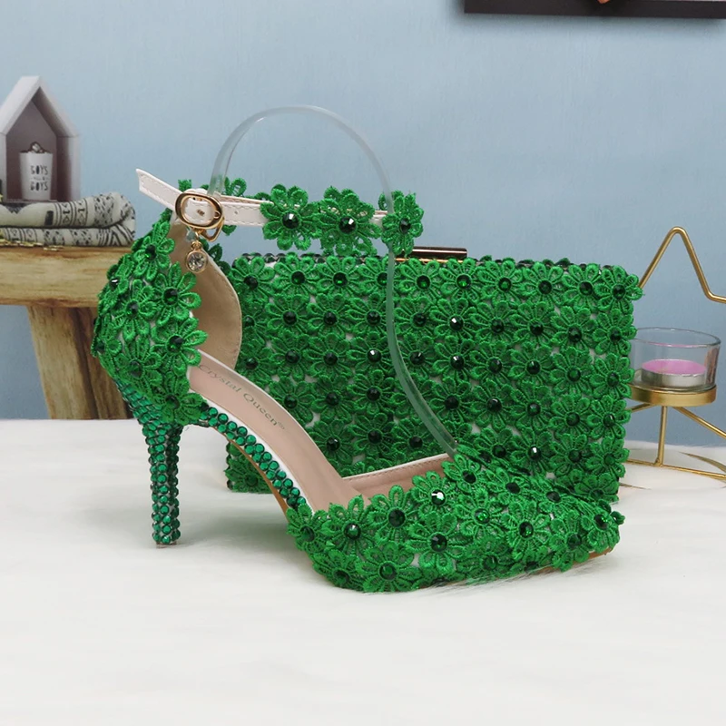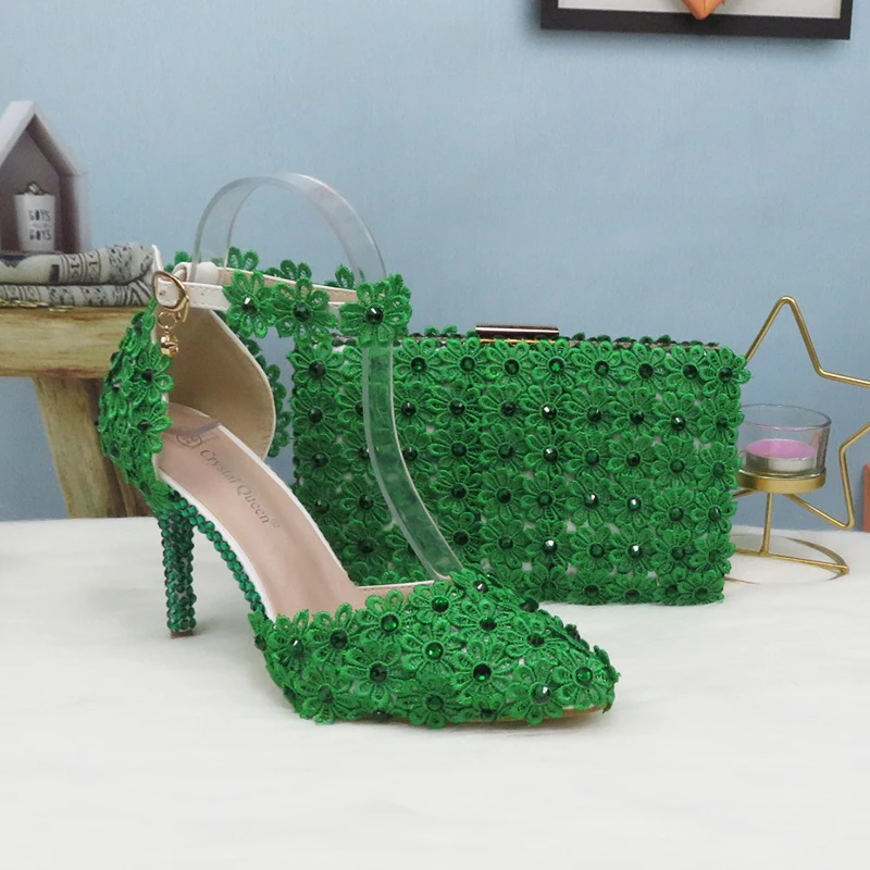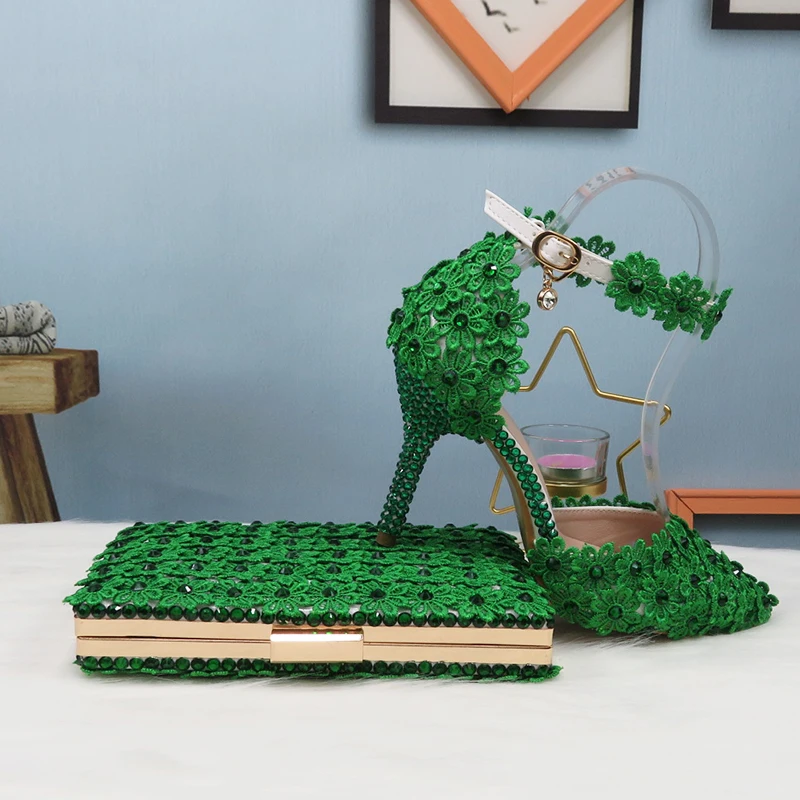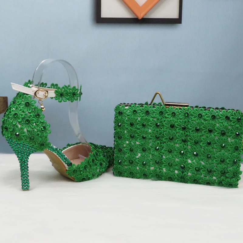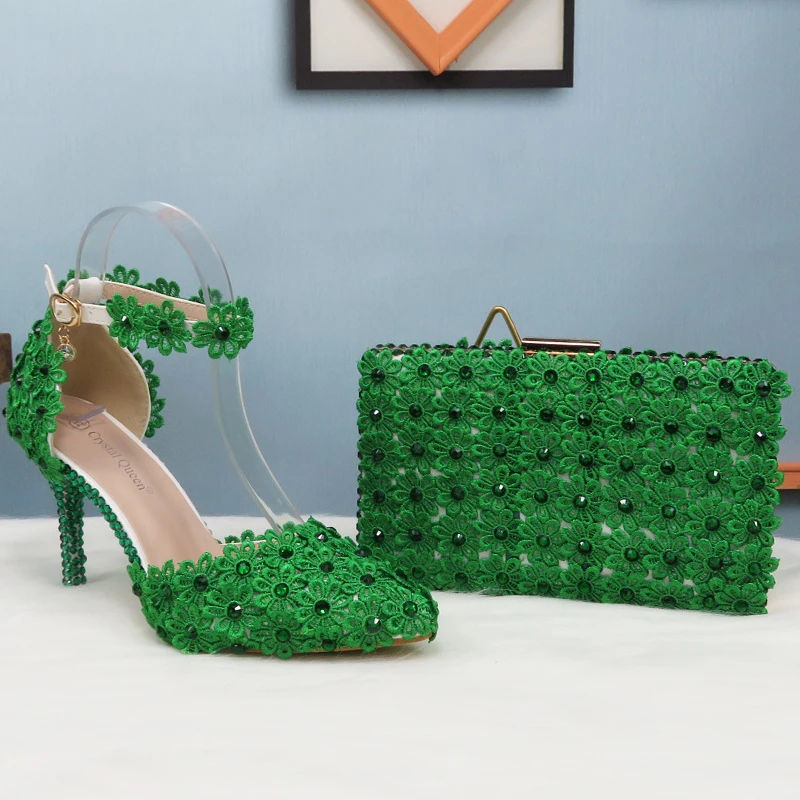 Свадебный комплект из туфель и сумочки с зелеными кружевными цветами, туфли на каблуке с жемчугом, с острым носком, с ремешком на щиколотке, женские вечерние туфли с подходящей сумкой на шнуровке