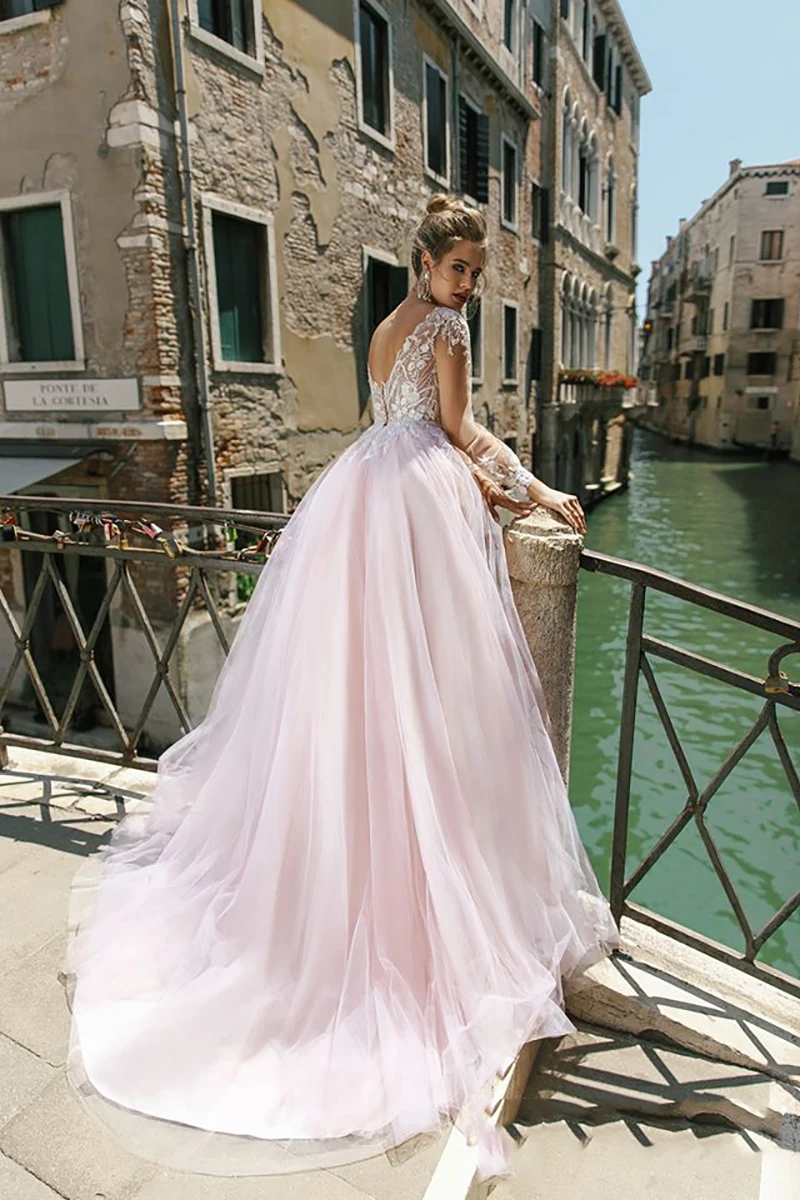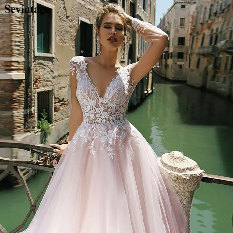 Женское свадебное платье со шлейфом Sevintage, розовое платье с глубоким V-образным вырезом, с рукавами-крылышками, индивидуальный пошив, 2020