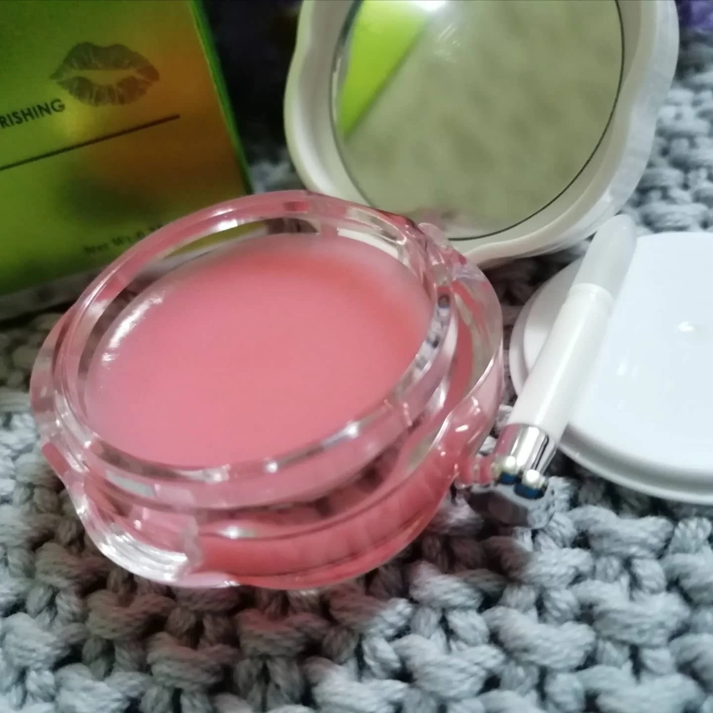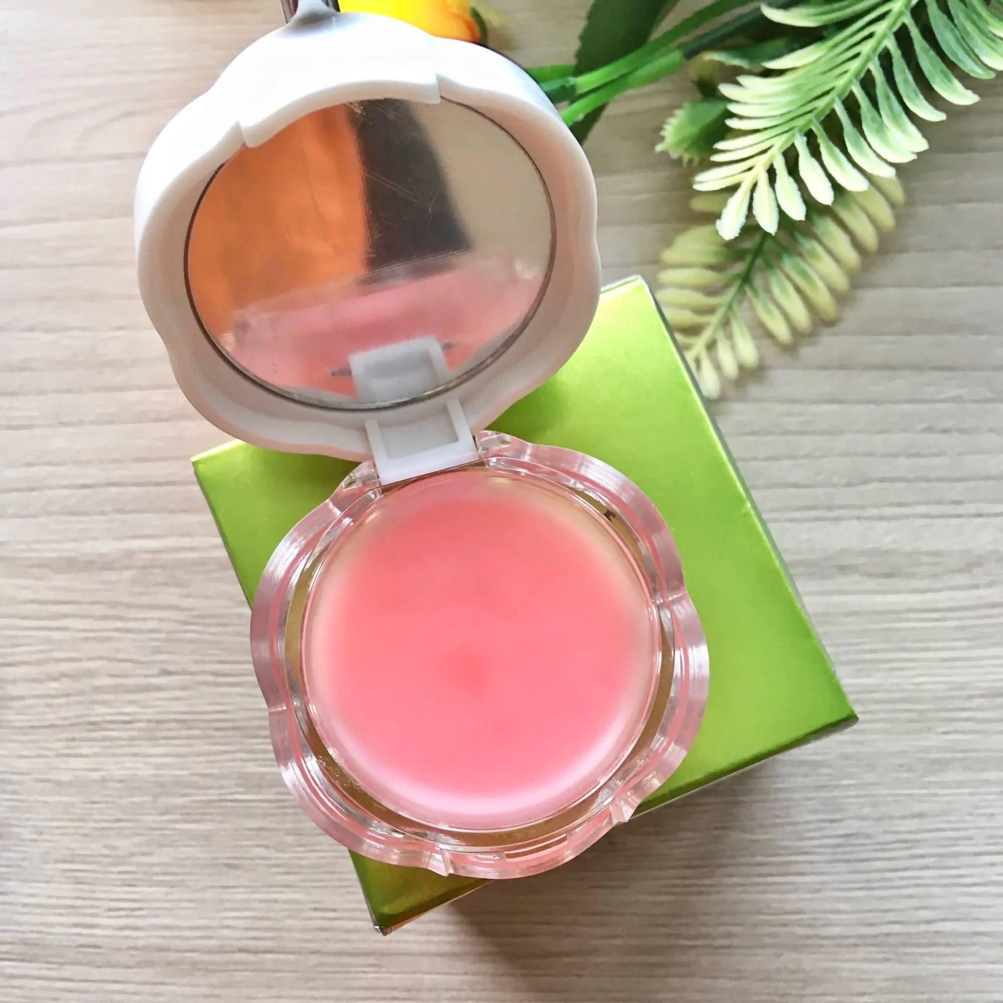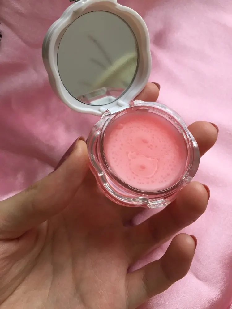 Доставка около месяца. Баночка с интересным дизайном, такую и не стыдно подарить. Внутри есть зеркало и лопатка с силиконовым наконечником. Бальзам светло-розового цвета, почти без запаха. Он отлично увлажняет и питает, устраненяет сухость и трещинки губ. Мне средство понравилось.