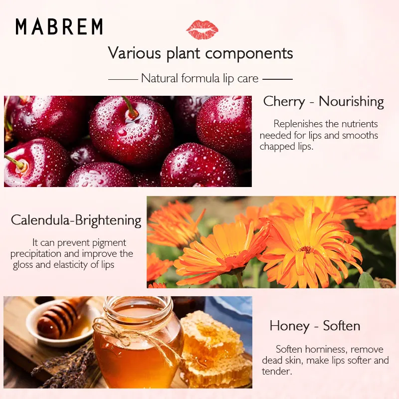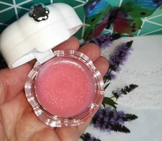 приятный, нежный, уходовый бальзам для губ, в красивом оформлении. содержит минеральное масло, пчелиный воск, токоферол ацетат, масло карите, экстракт вишни и календулы. создает защитную пленку, которая питает и смягчает губы, убирает шелушение, мелкие трещины и морщинки. в инструкции написано описан принцип действия - гелевая структура экстрактов растений может управлять кератином, мягко удалять омертвевшую кожу, глубоко впитывается, делает губы пухлыми. имеет полупрозрачный розовый оттенок, при нанесении не заметен, губы выглядят естественными с влажным глянцем. использую вечером и на ночь, как восстанавливающее средство после использования матовых помад. в инструкции написано, что можно использовать и днем. почти без запаха и вкуса, не меняет вкус пищи, на губах комфортный
