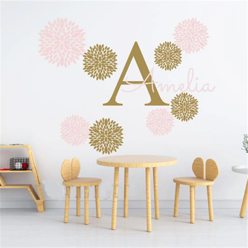 Монограмма, настенные наклейки, Детская Наклейка с именем, детская комната, настенные наклейки, белая и розовая настенная роспись, цветок Далии, Настенная Наклейка HY270