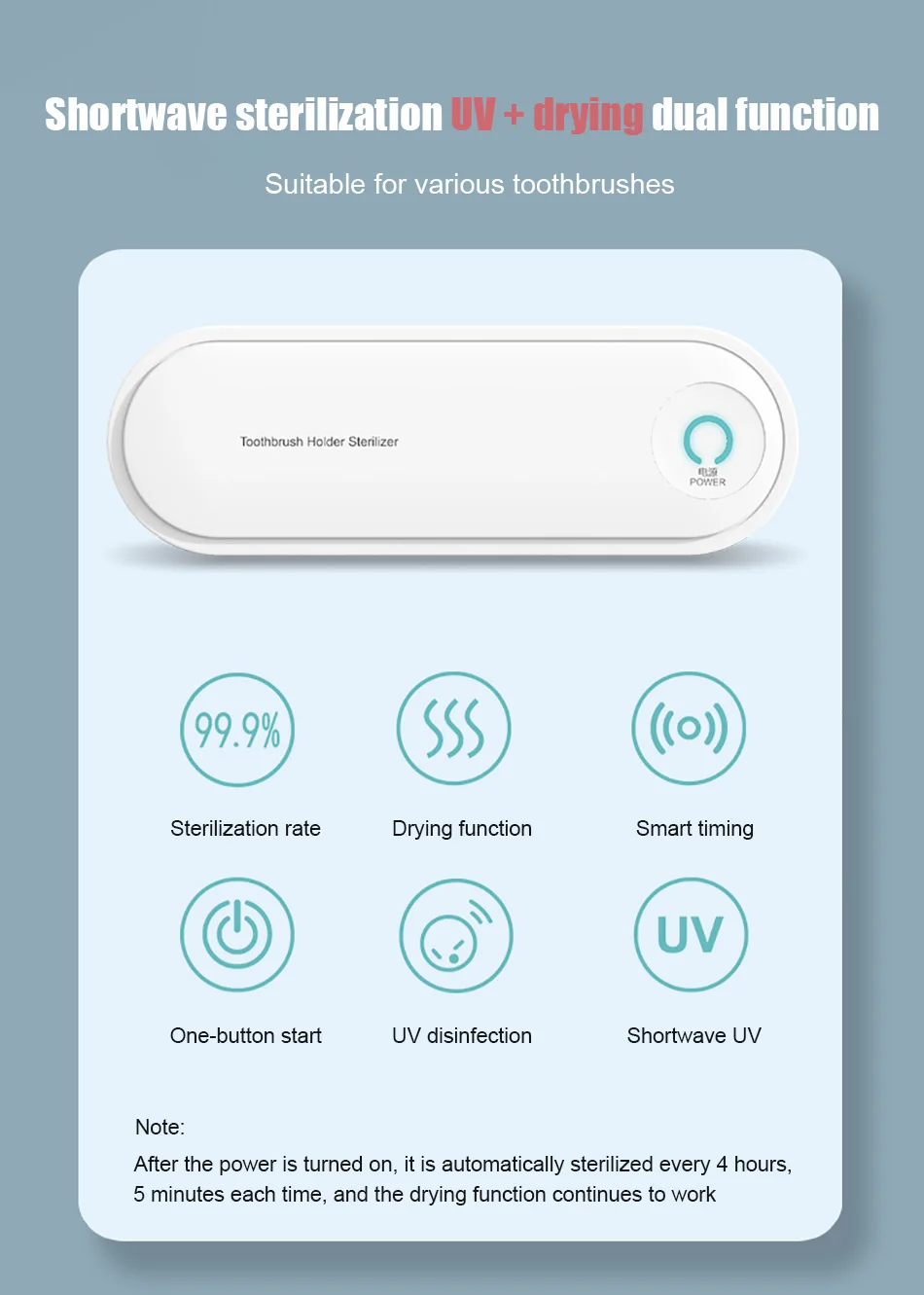 1. Коротковолновая стерилизация UV + сушка двойная функция, эффективная Стерилизация и Бактериостаз. Умная синхронизация, запуск одной кнопкой. После включения питания, он автоматически стерилизуется каждые 4 часа, 5 минут каждый раз, и функция сушки продолжает работать
