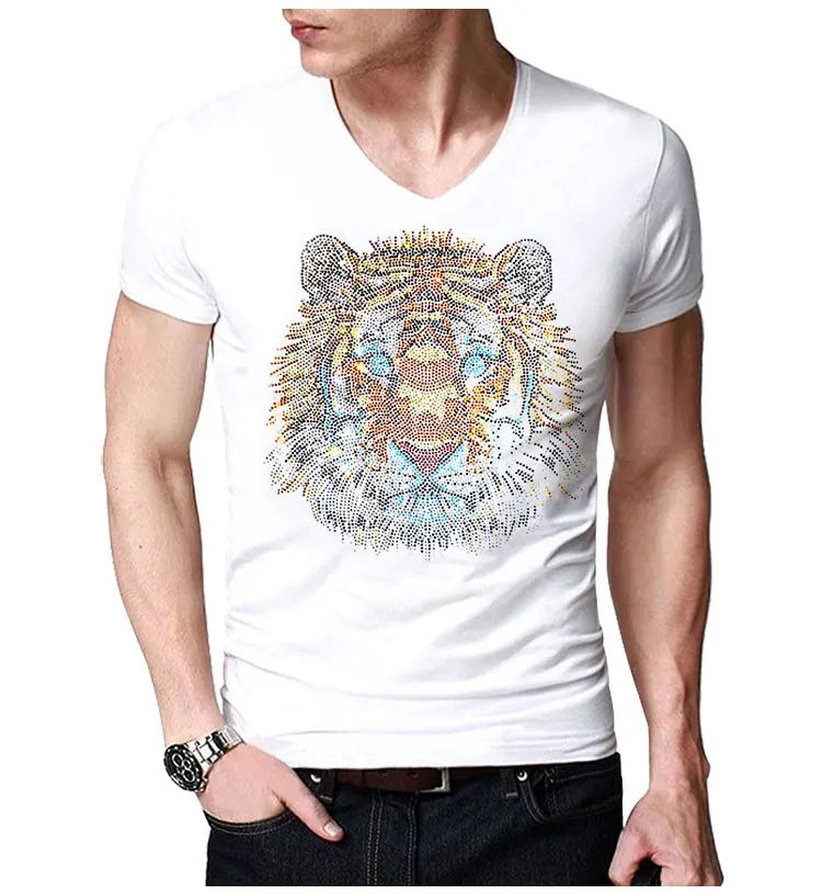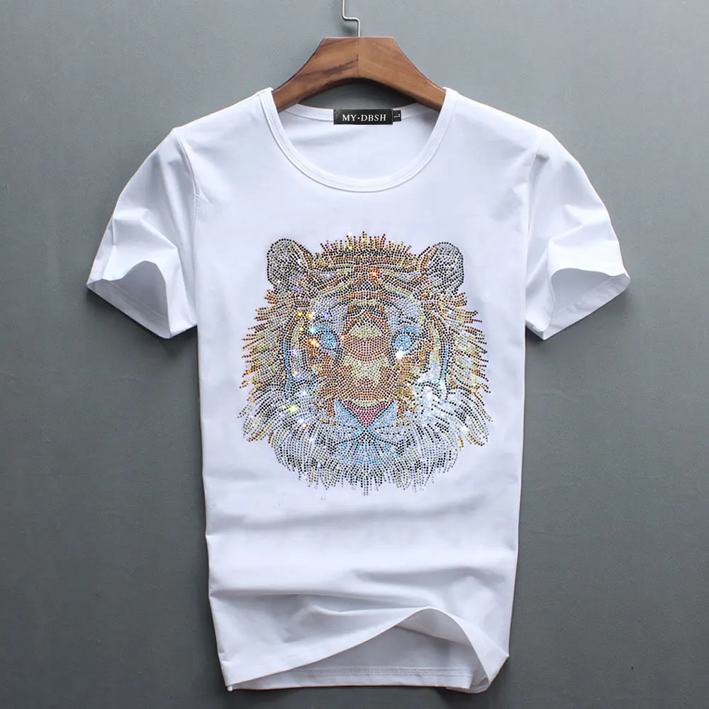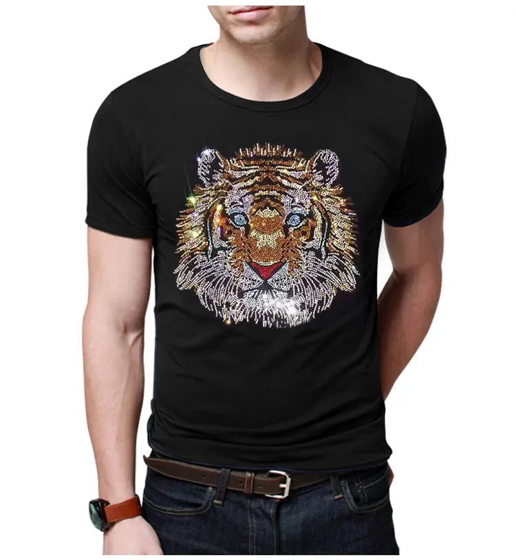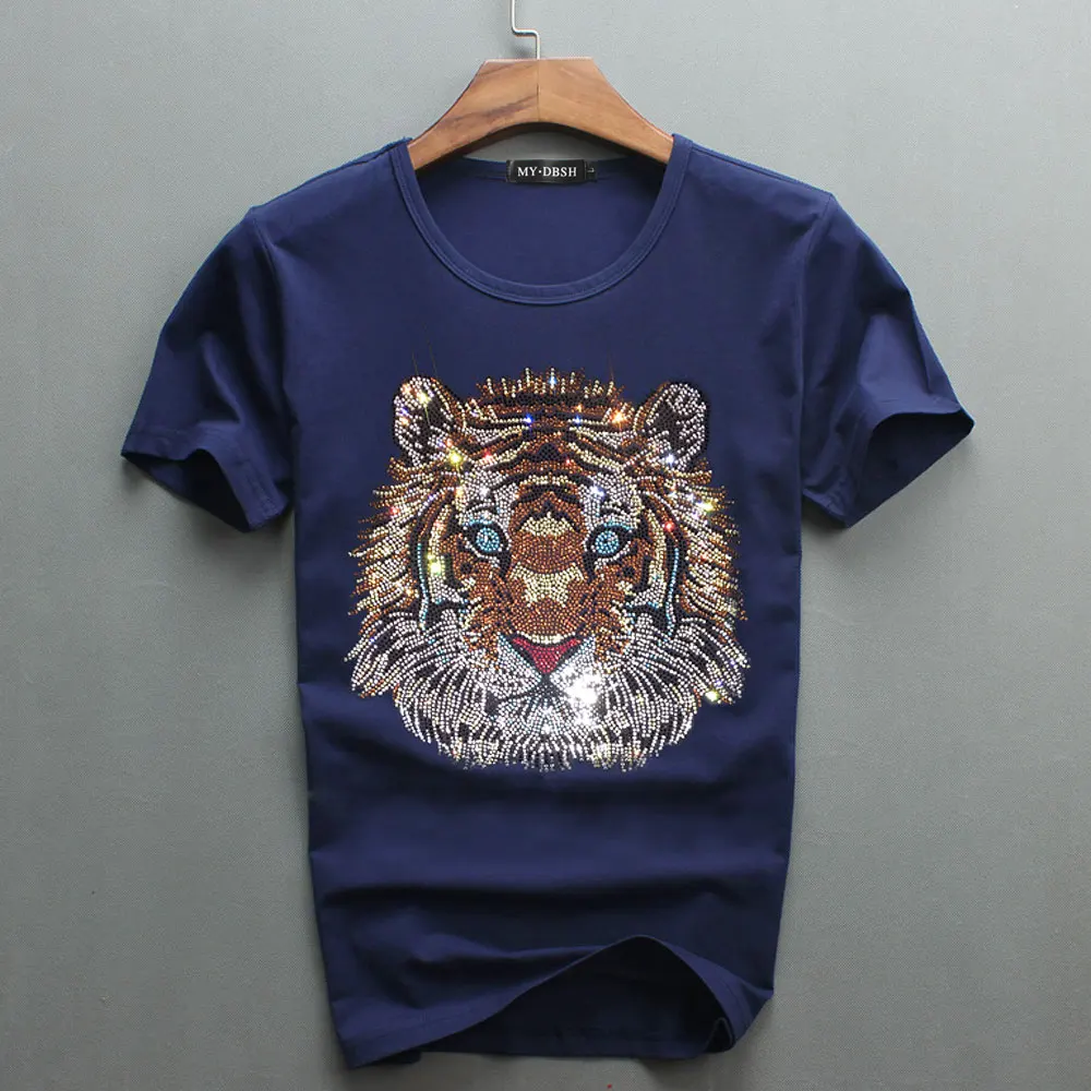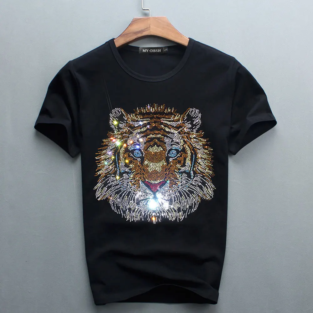 Футболка мужская с тигром, хлопковая Модная рубашка, Роскошный топ, майка с бриллиантами, со стразами, дизайнерские, лето