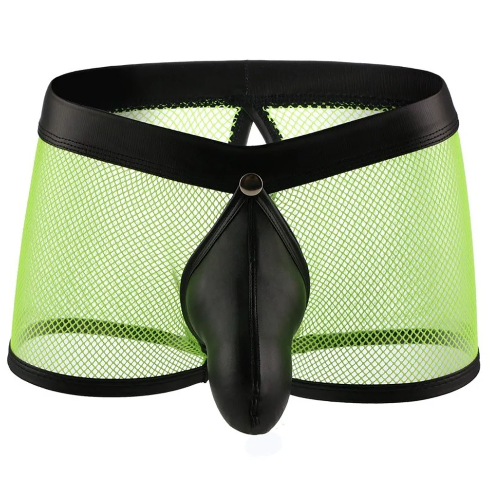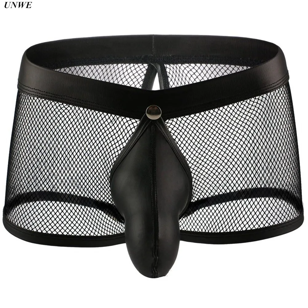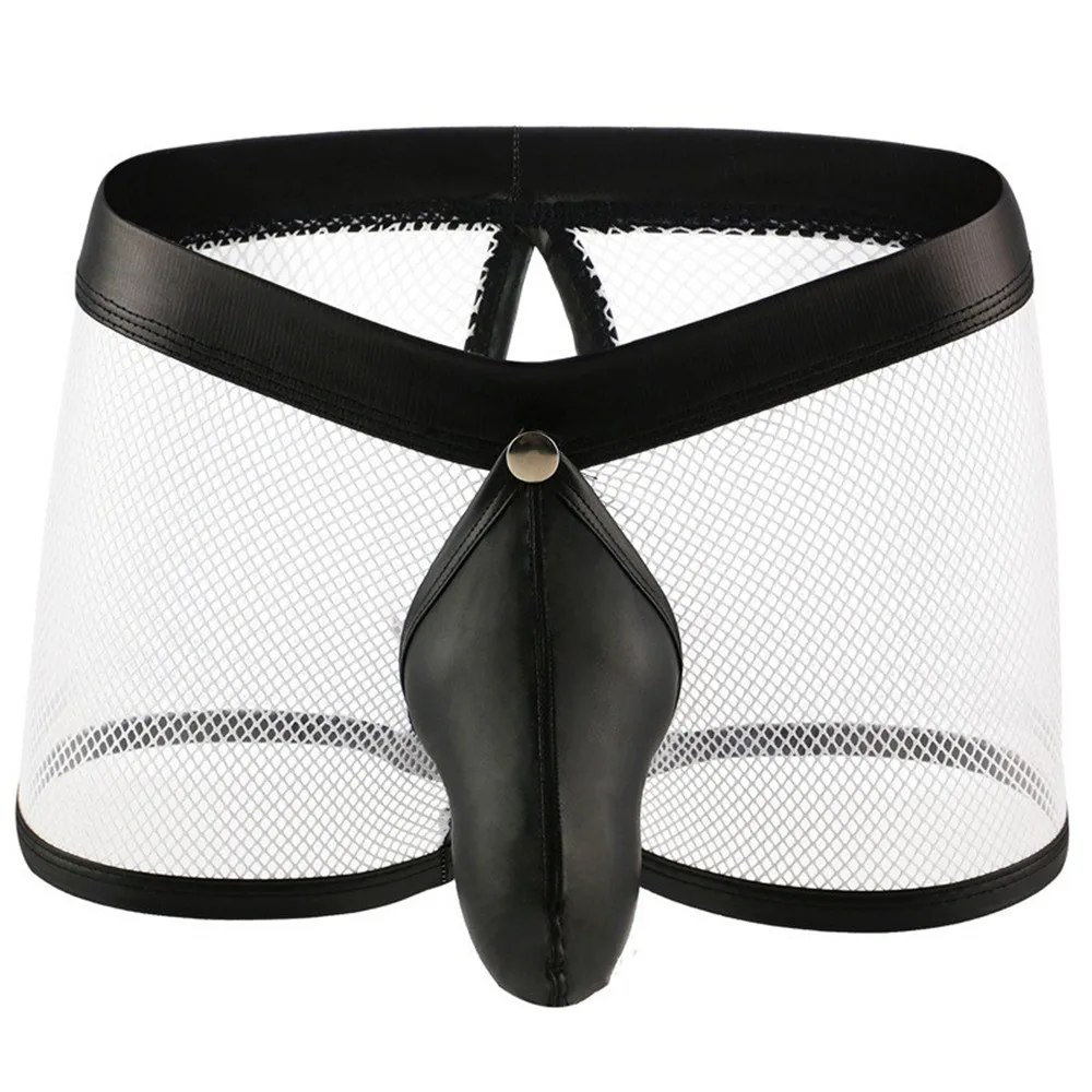 Сексуальное нижнее белье для мужчин, прозрачные плавки, шорты для влюбленных, из искусственной кожи + сетчатые трусы-боксеры, большой карман для пениса