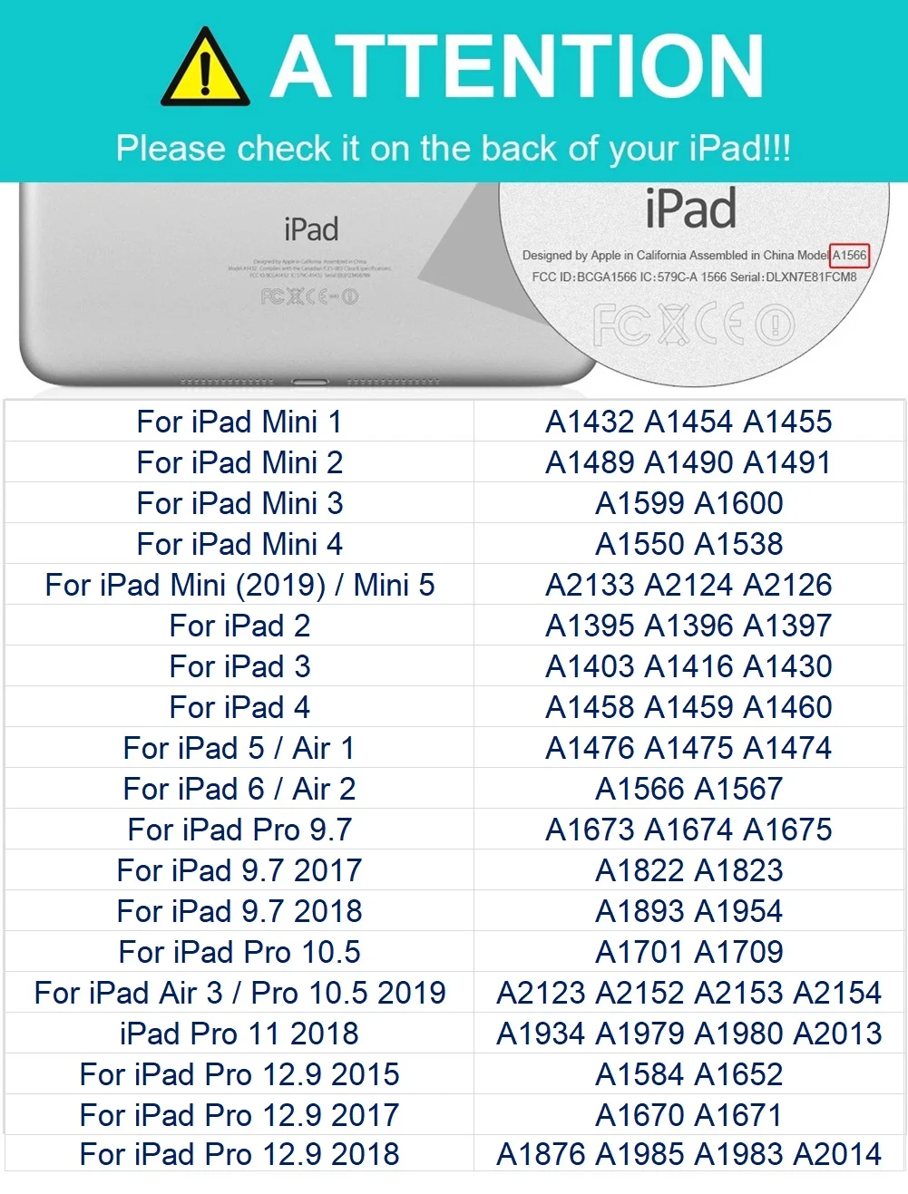 Этот чехол подходит только для моделей:Для iPad Air ( A1476,A1475,A1474)Для iPad Air 2 ( A1566,A1567)Для iPad Pro 9,7 (A1673,A1674,A1675)Для iPad 9,7 2017 (5-й) ( A1822,A1823)Для iPad 9,7 2018 (6th) ( A1893,A1954)Для iPad Mini 1 ( A1432,A1454,A1455)Для iPad Mini 2 ( A1489,A1490,A1491)Для iPad Mini 3 ( A1599,A1600)Для iPad Mini 4 ( A1550,A1538)Для iPad Mini 2019 / Mini 5 ( A2133,A2124,A2126)Нельзя использовать для других моделей планшетов. Перед размещением заказа, пожалуйста, внимательно проверьте модели ваших планшетов, как показано ниже.