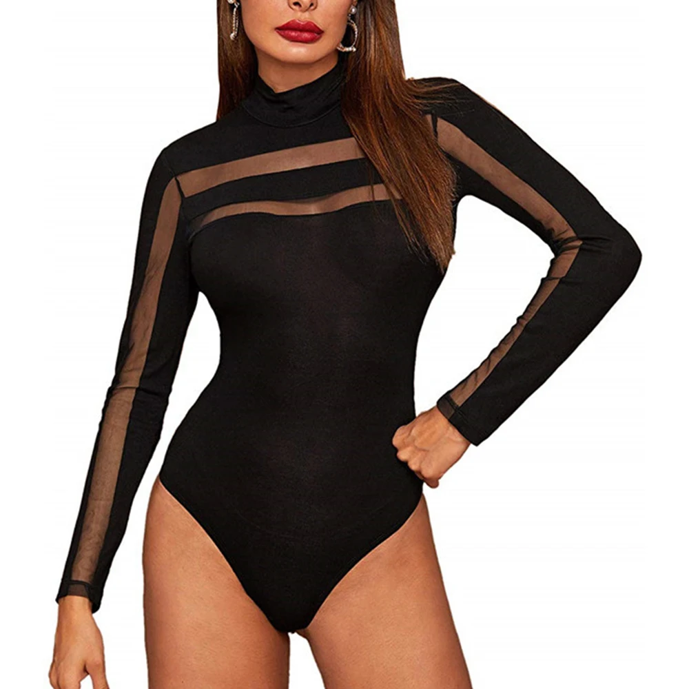2020 Модный женский сетчатый сексуальный боди с длинным рукавом, комбинезон с высоким воротом, облегающий боди, топы, рубашки, Клубная одежда черного цвета