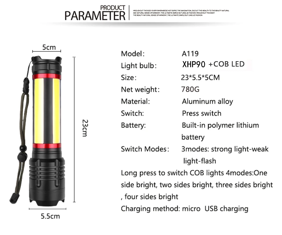 Нажмите переключатель 3 секунды для включения светодиода COB (4 режима 1 светодиод-2 светодиода-3 светодиода-4 светодиода)