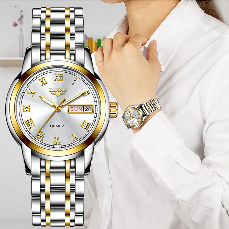 Часы наручные LIGE женские золотистые, креативные водонепроницаемые с браслетом из стали, 2020