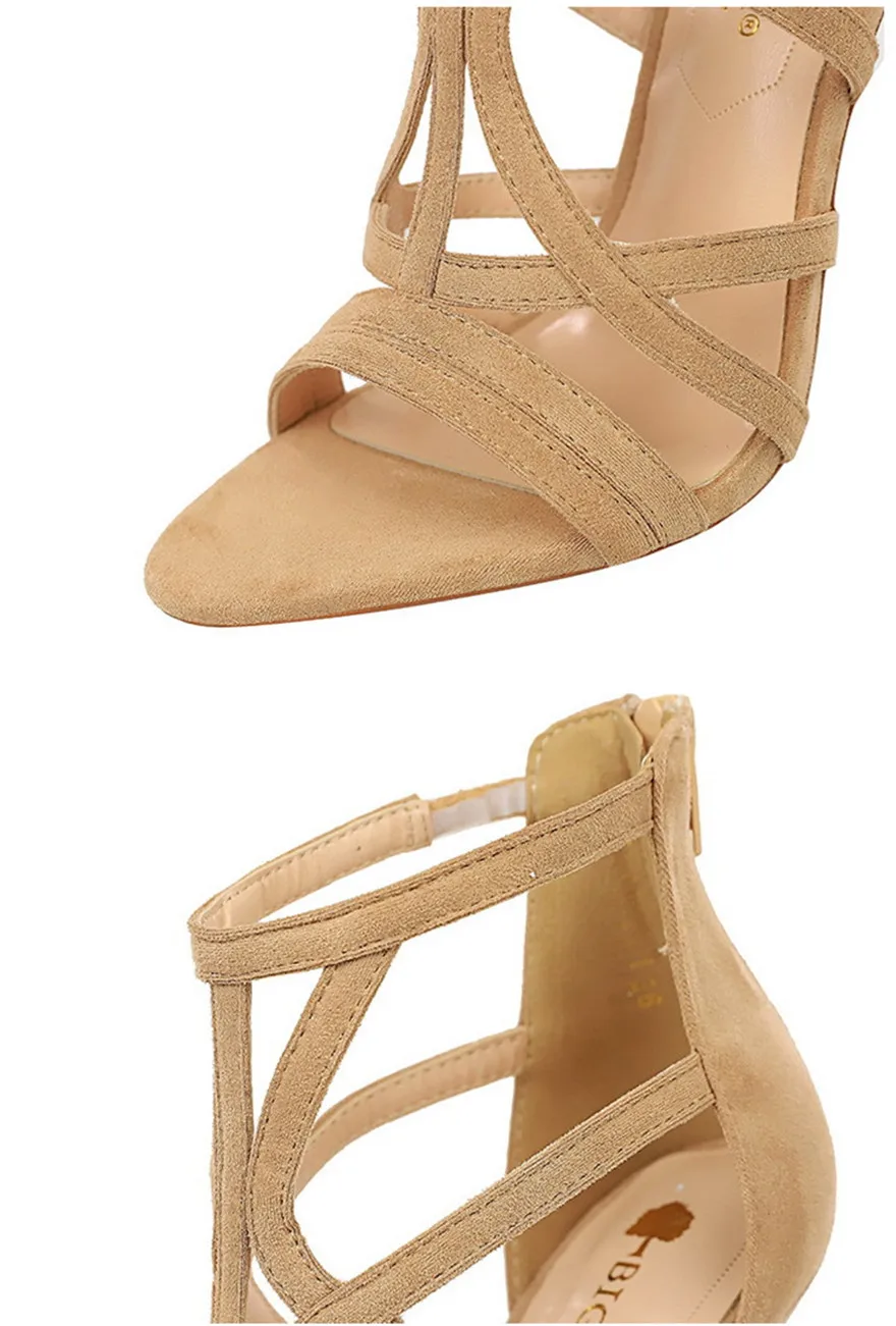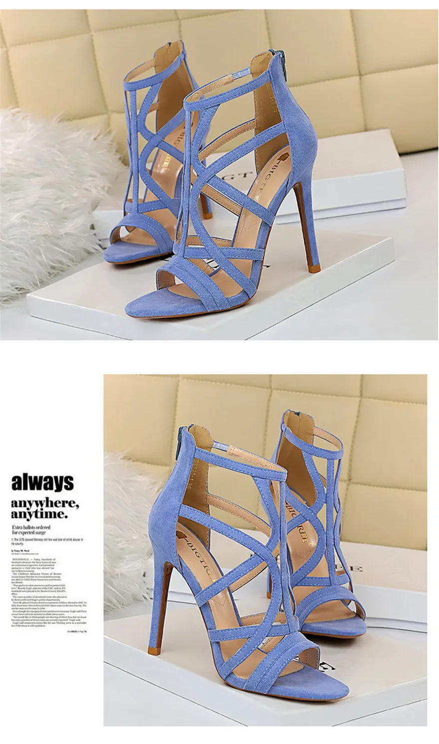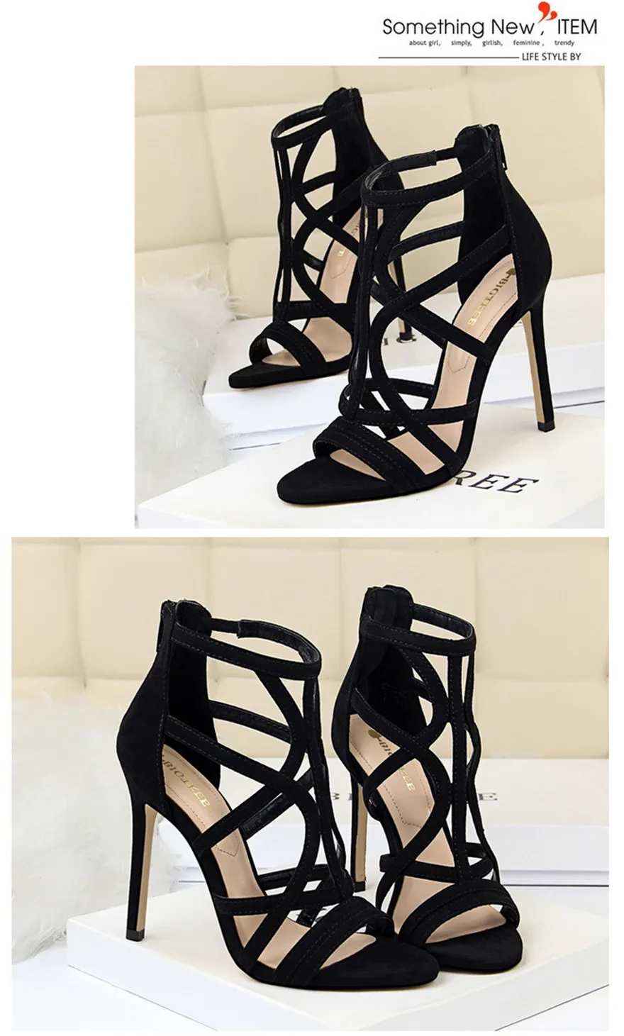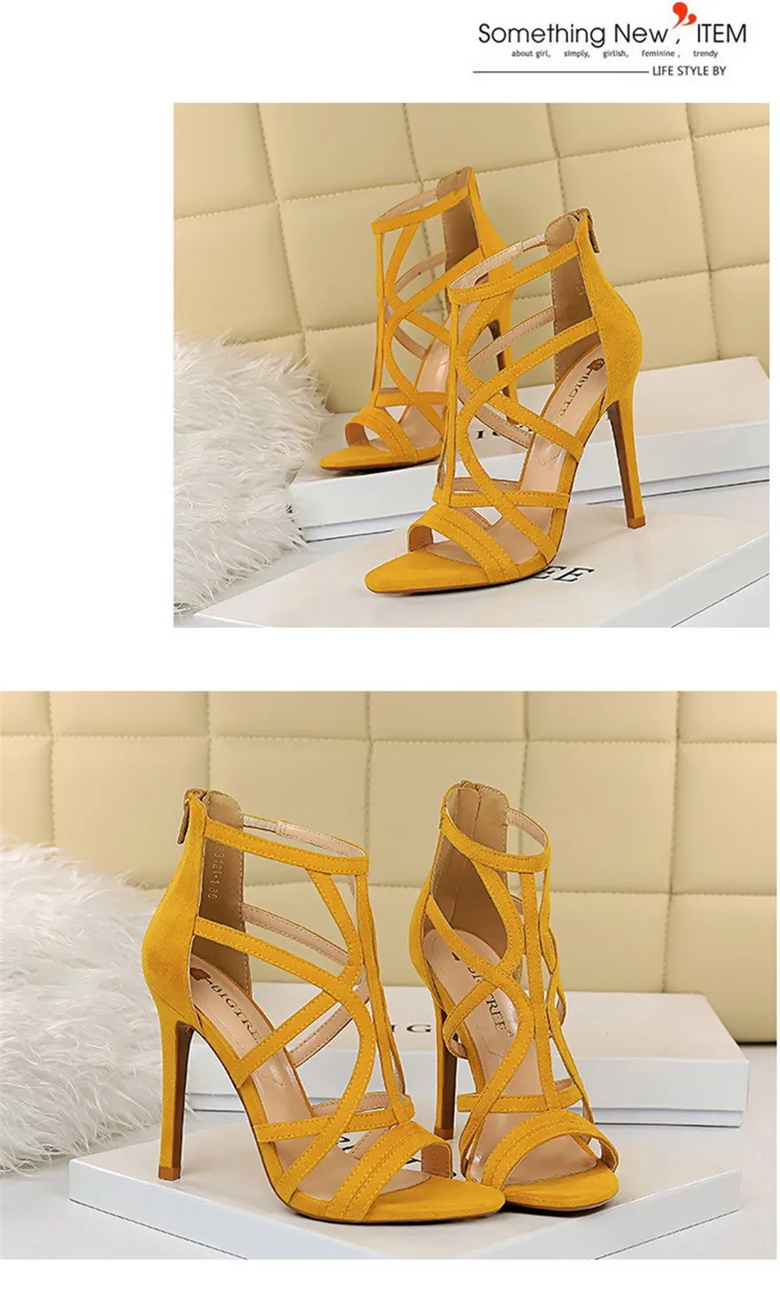 Женские босоножки на шпильке в римском стиле; Цвет черный, красный, желтый; Обувь из флока на полой подошве; Летние женские пикантные вечерние туфли-лодочки на высоком каблуке с открытым носком и молнией сзади