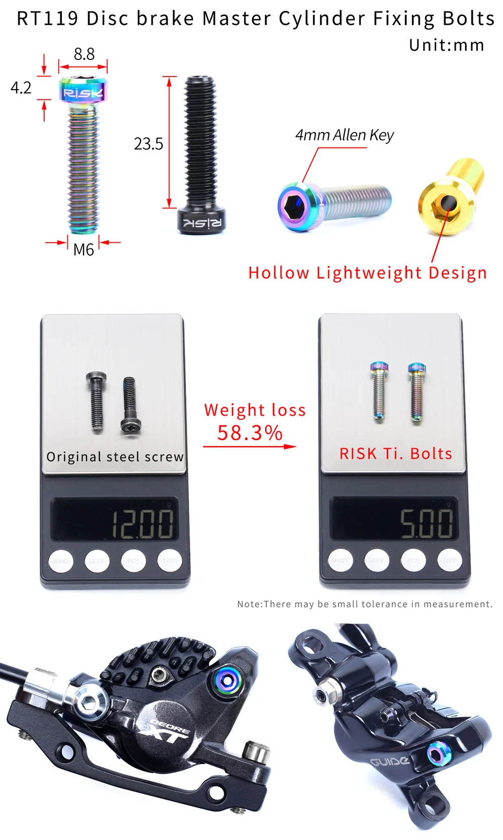Крепежные болты главного цилиндра дискового тормоза RT119 блок: мм 4 мм шестигранный ключ полый легкий вес конструкция сравнение веса оригинальные винты из титанового сплава риск потери веса 58.3% Примечание: возможны небольшие погрешности в измерениях.