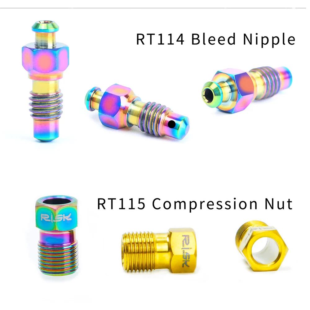 Тормозной ниппель RISK RT114 M6 подходит для всех тормозов масляных дисков SHIMANO. Ниппель следует использовать с оригинальным уплотнительным кольцом. Сравнение веса оригинальные винты из титанового сплава с риском потери веса 41.8% Примечание: возможны небольшие погрешности в измерениях.