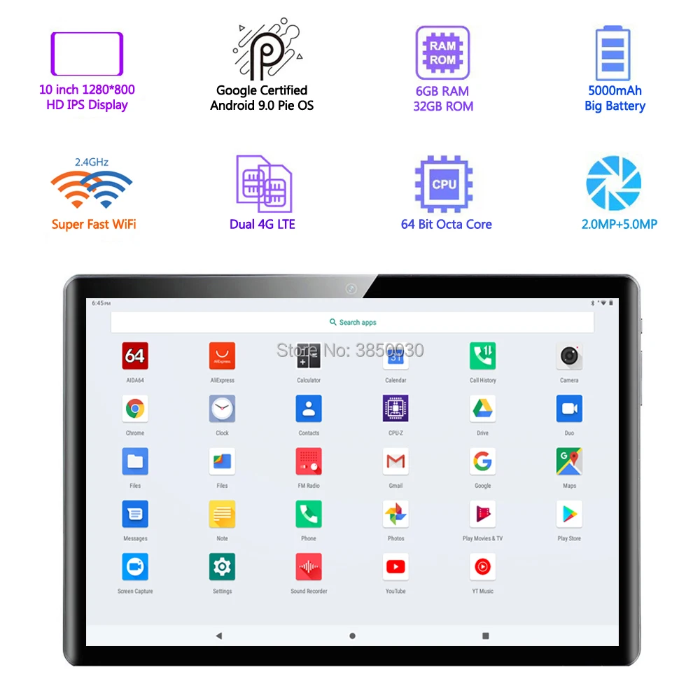 Планшет Android 9.0, 10 дюймов, Google Play, 8 ядер, ОЗУ 6 ГБ + 32 Гб ПЗУ, 4G LTE, Смартфон android 9, GPS, Wi-Fi, 1280*800, IPS, планшеты 10 дюймов