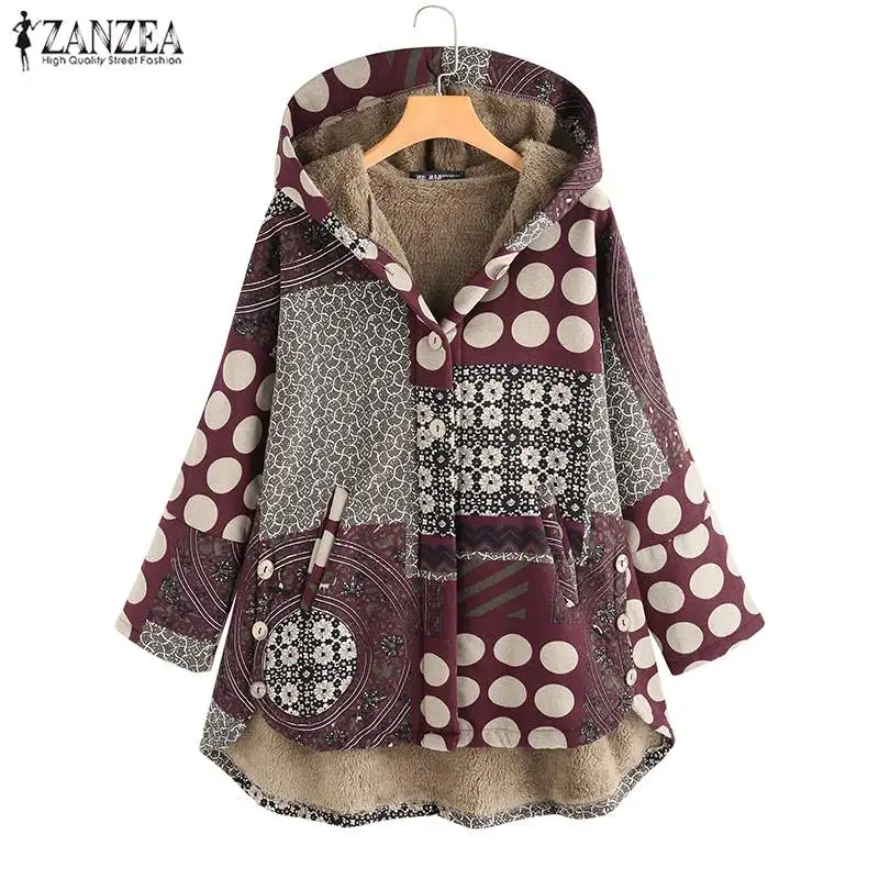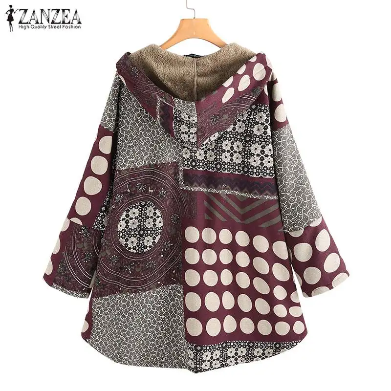 Коллекция 2022 года, пальто ZANZEA с этническим принтом, женская верхняя одежда, повседневные куртки с длинным рукавом и меховой подкладкой, Женская ветровка с капюшоном, S-топы