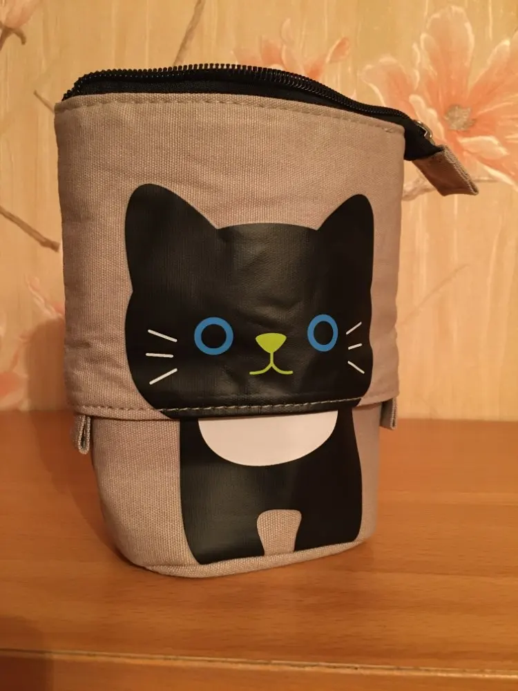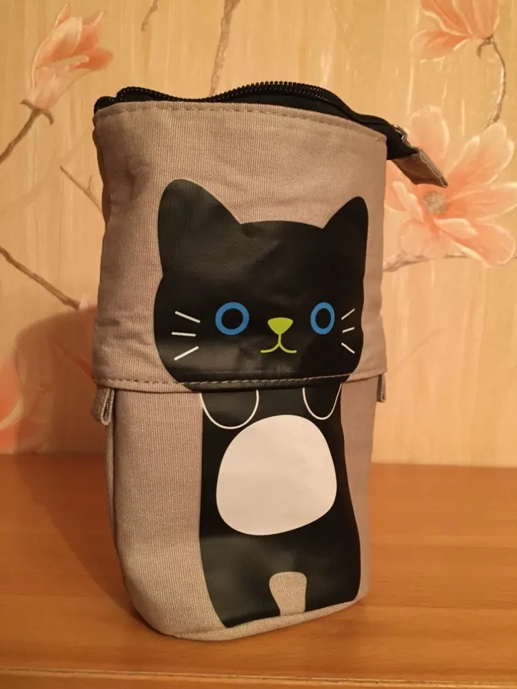 Не серый, а бежевый, с чёрным котиком. Внутри пенала есть несколько кармашков под ручки-штрих. Опускается чуть меньше, чем наполовину. Неустойчив. Около 18 см в высоту.
