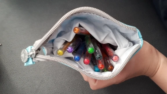 Красивый вместительный пенал, поместился набор карандашей, набор фломастеров и кисти, в высоту тоже хорошо- застёгивается, ничего не мешает