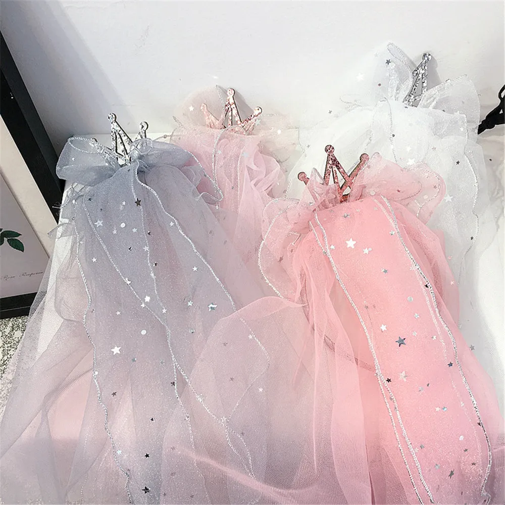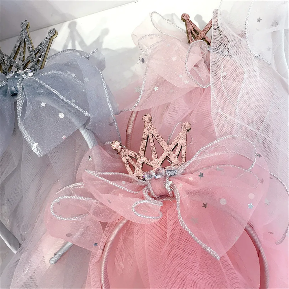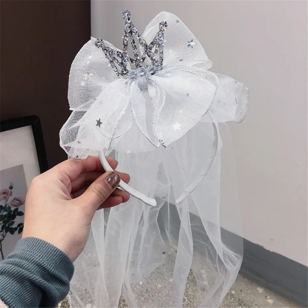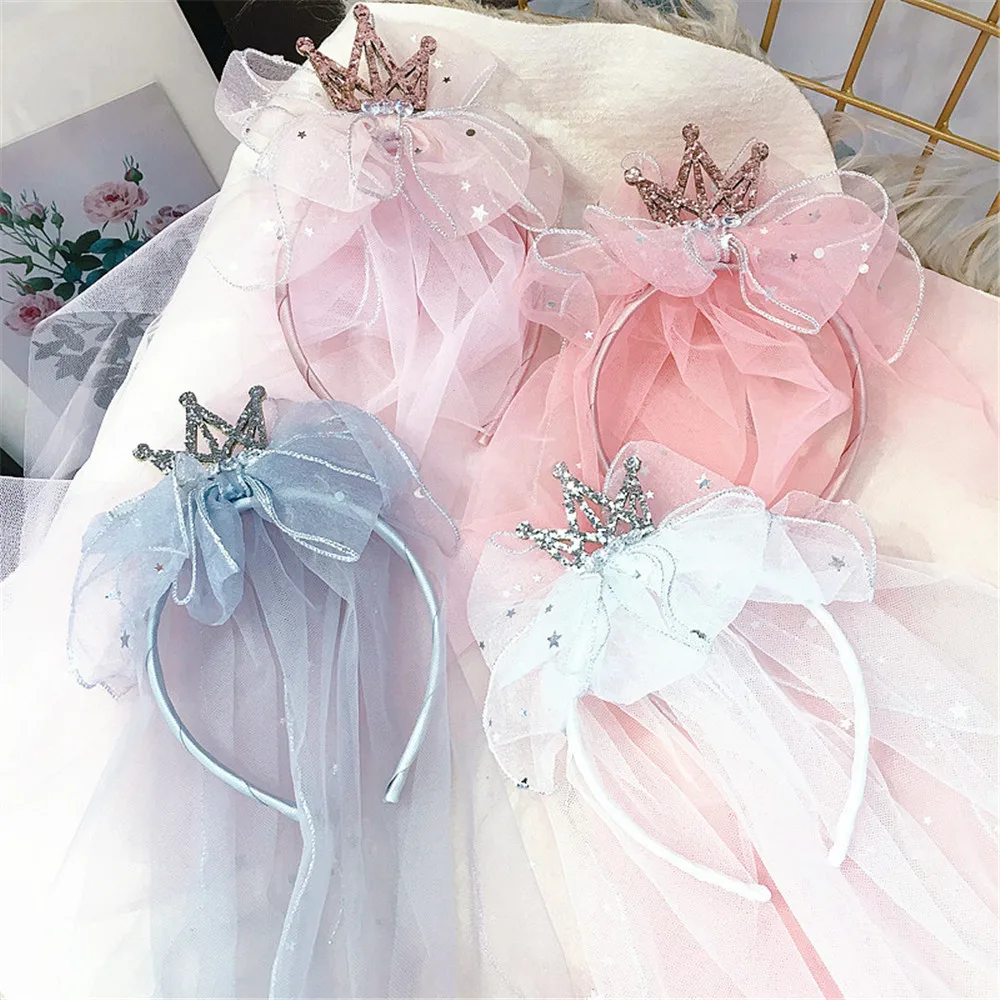 Повязки на голову для девочек, повязки для волос принцессы, пряжа, вуаль, корона, бант, цветок, Детские аксессуары для волос в Корейском стиле ручной работы, оптовая продажа