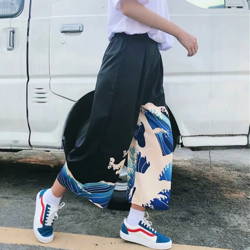 Традиционная японская одежда, брюки-Капри в стиле бохо, модные японские брюки с широкими штанинами и красными коронами журавлей, кимоно, укороченные брюки FF2576