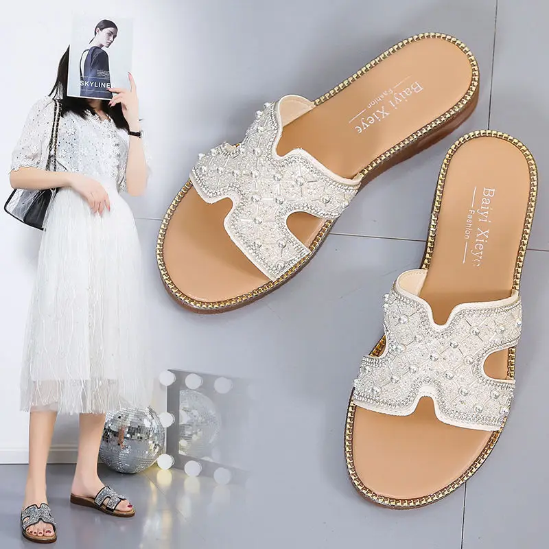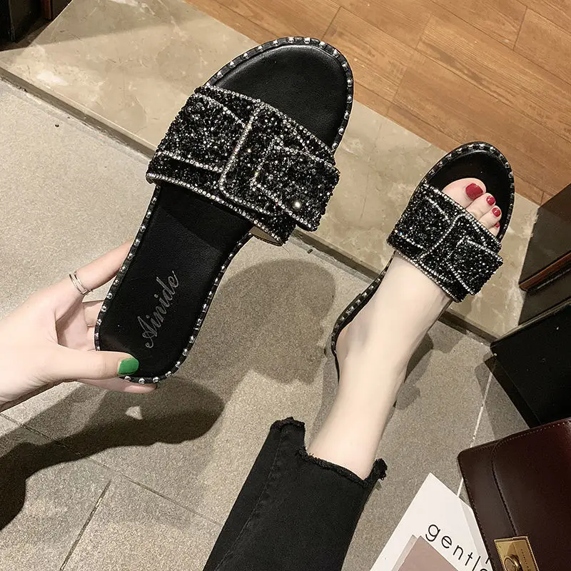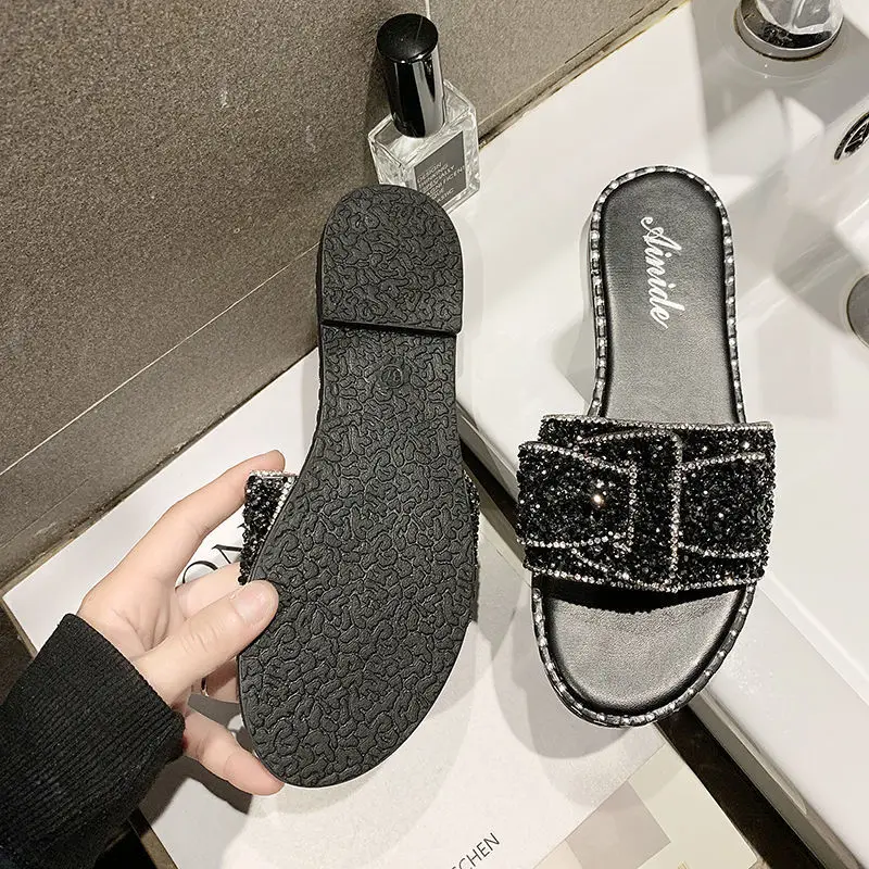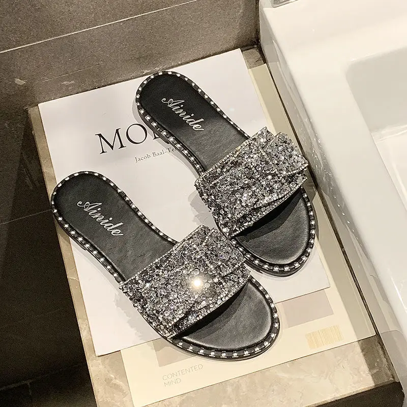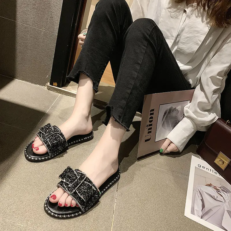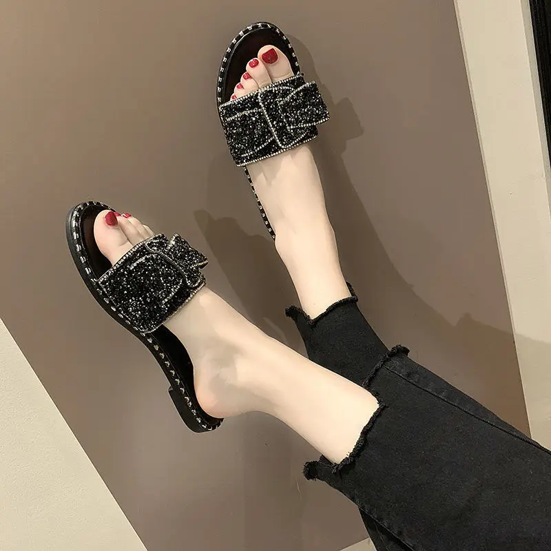 Шлепанцы Стразы с бантом женские, летние тапочки, блестящие мюли, сланцы, черные, размеры 43