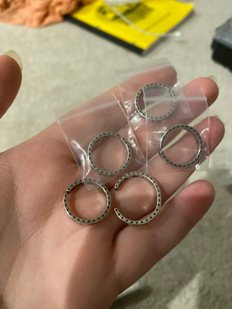Пришло с браком( 1 и 2 фото ) открыла спор. Вернула пол сумы. В целом выглядит не плохо. Размер регулируется, но очень туго. Ношу чуть больше недели, пока что не потемнело ( хотя мою не снимая и тд ). В украину пришло за месяц, на укрпочту. Отслеживалось. Пришло в кейсе и маленьком зип пакете ( последнее фото) ставлю по 4 заезды, ибо огорчил брак. Но спасибо хоть пол сумы вернули ...