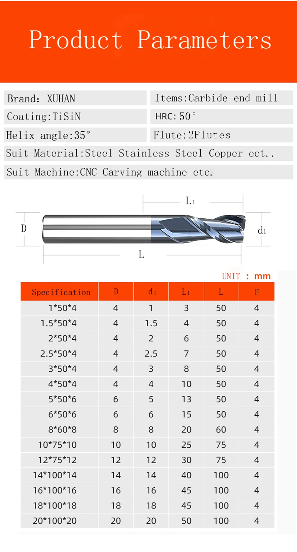 Концевая фреза HRC50 из карбида вольфрамовой стали с 2 канавками