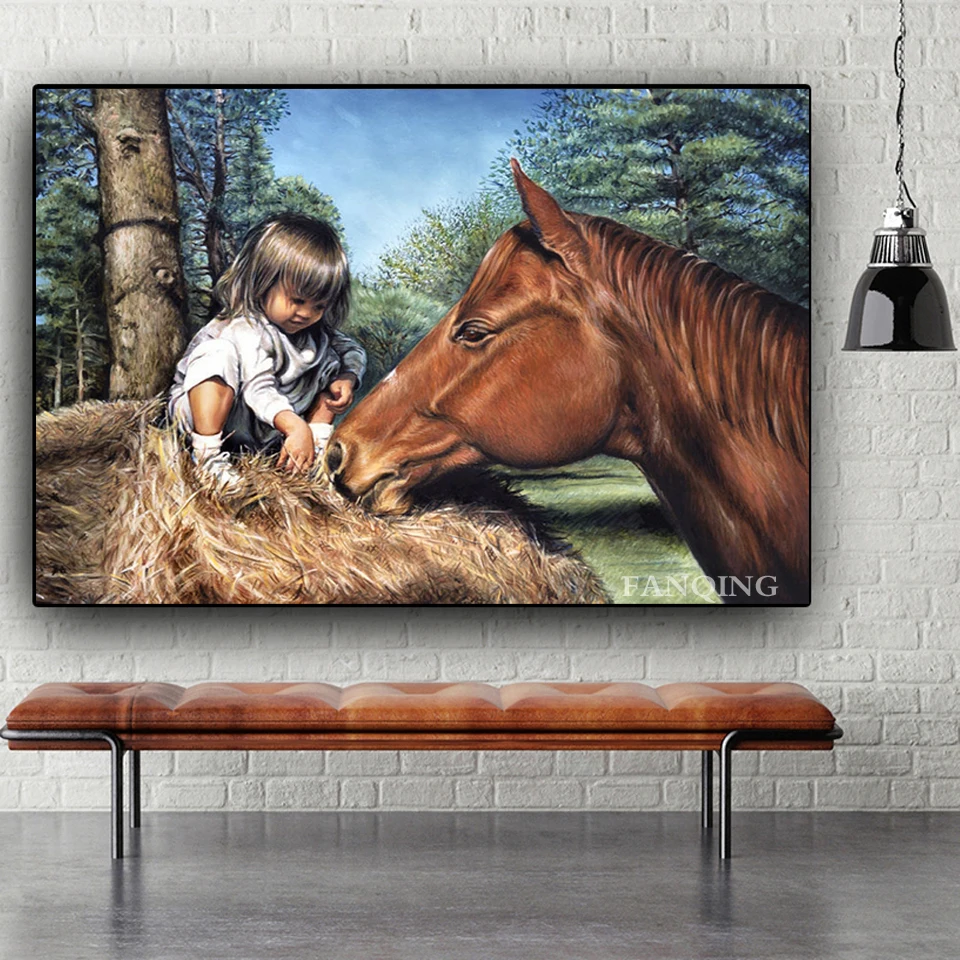 Алмазная живопись с маленькой девочкой и лошадью, полноразмернаякруглая вышивка крестиком, мозаика, алмазная вышивка Стразы, домашний декор