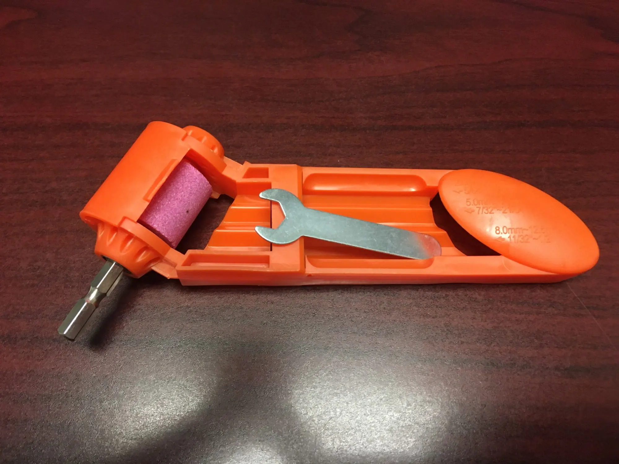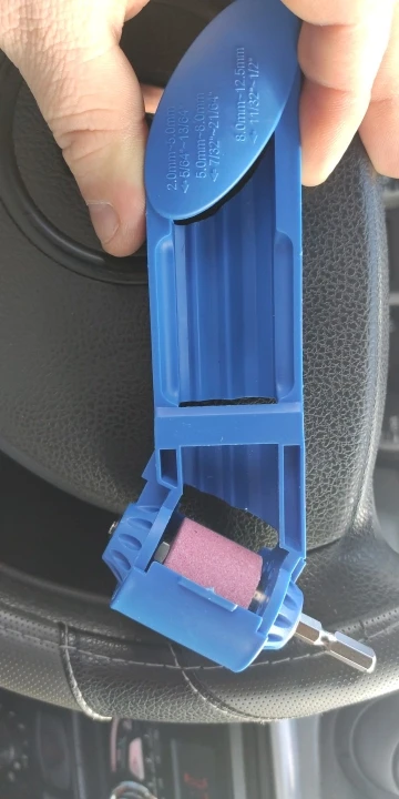 Короче это шляпа. Выдержать угол и равномерность заточки на порядок сложнее чем просто на камне. Вы не сможете держать шуруповерт/дрель и придерживая эту приспособу выставлять правильно по оси сверло. Не покупайте.