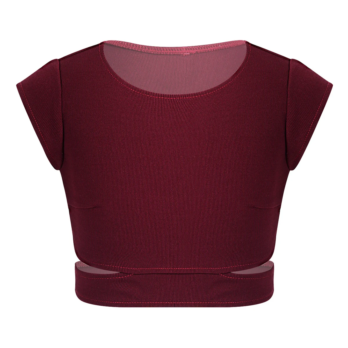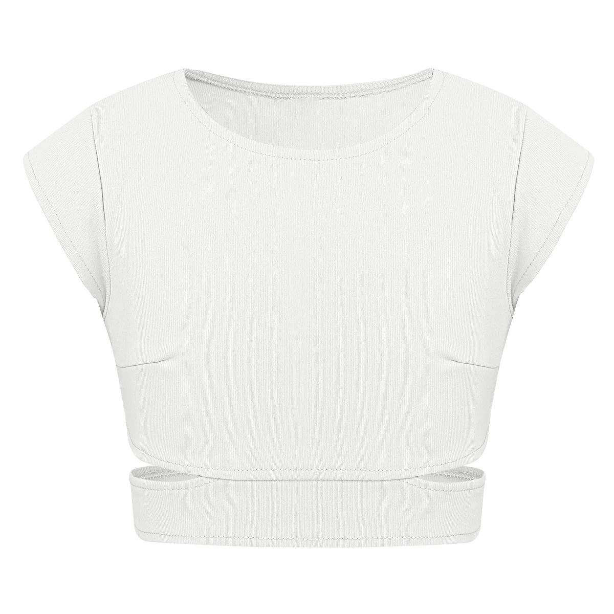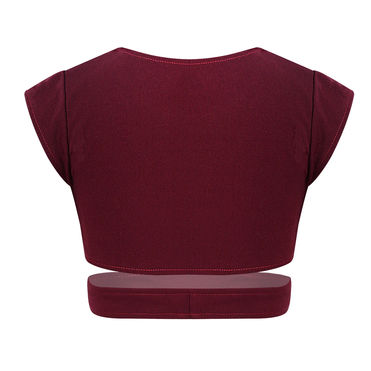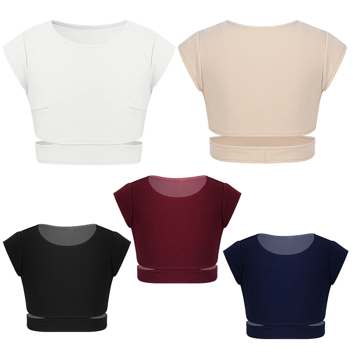Детские танцевальные укороченные топы для девочек, эластичные майки с вырезом на талии и рукавами-крылышками, бюстгальтер, топы для балета, танцев, выступлений, тренировок