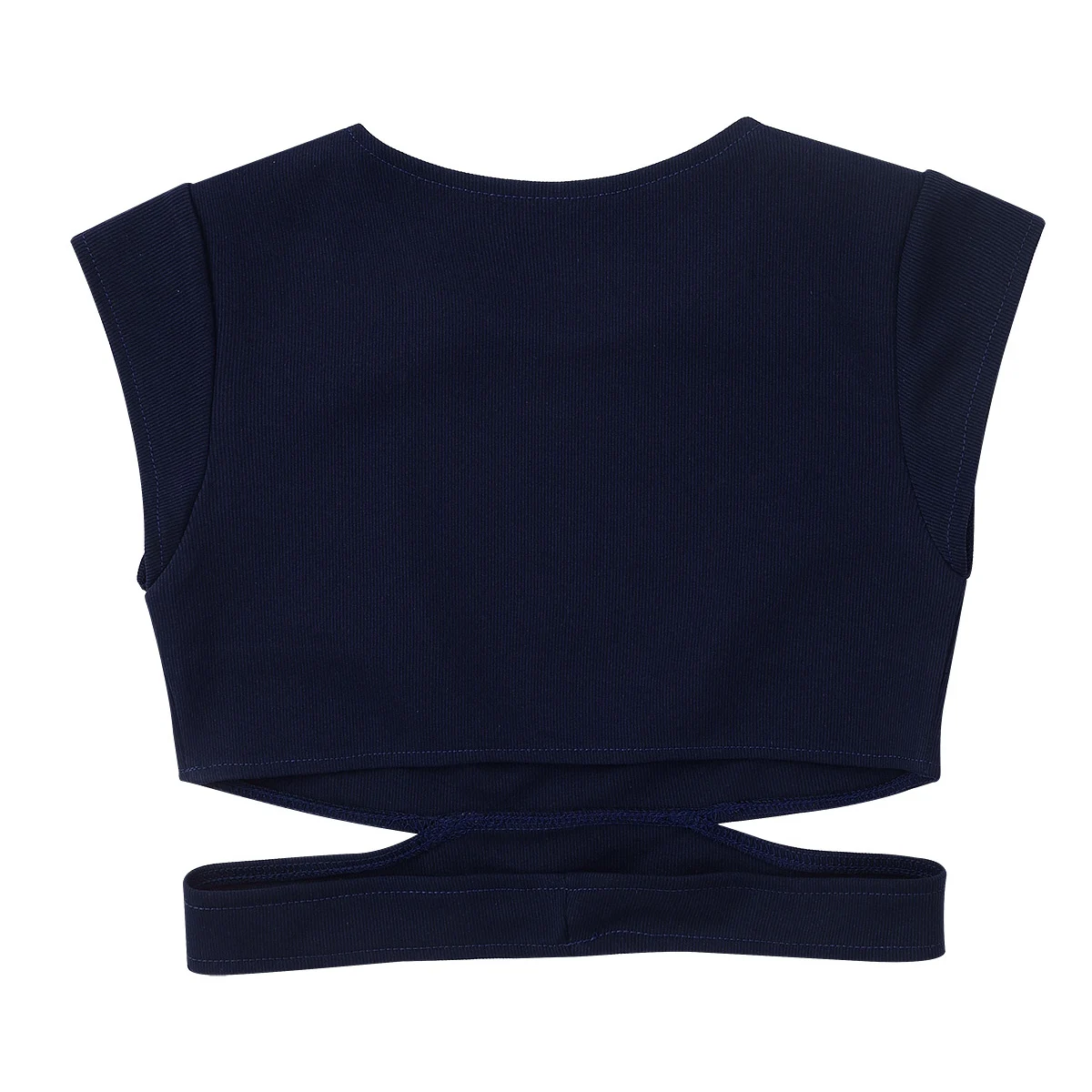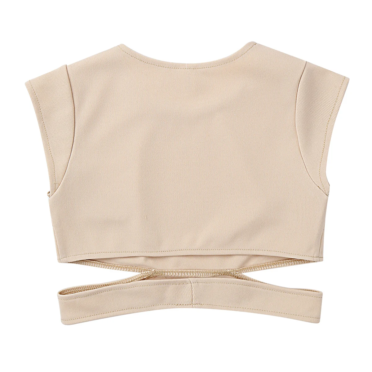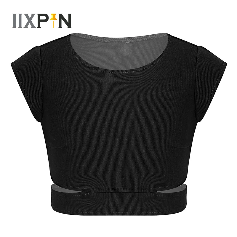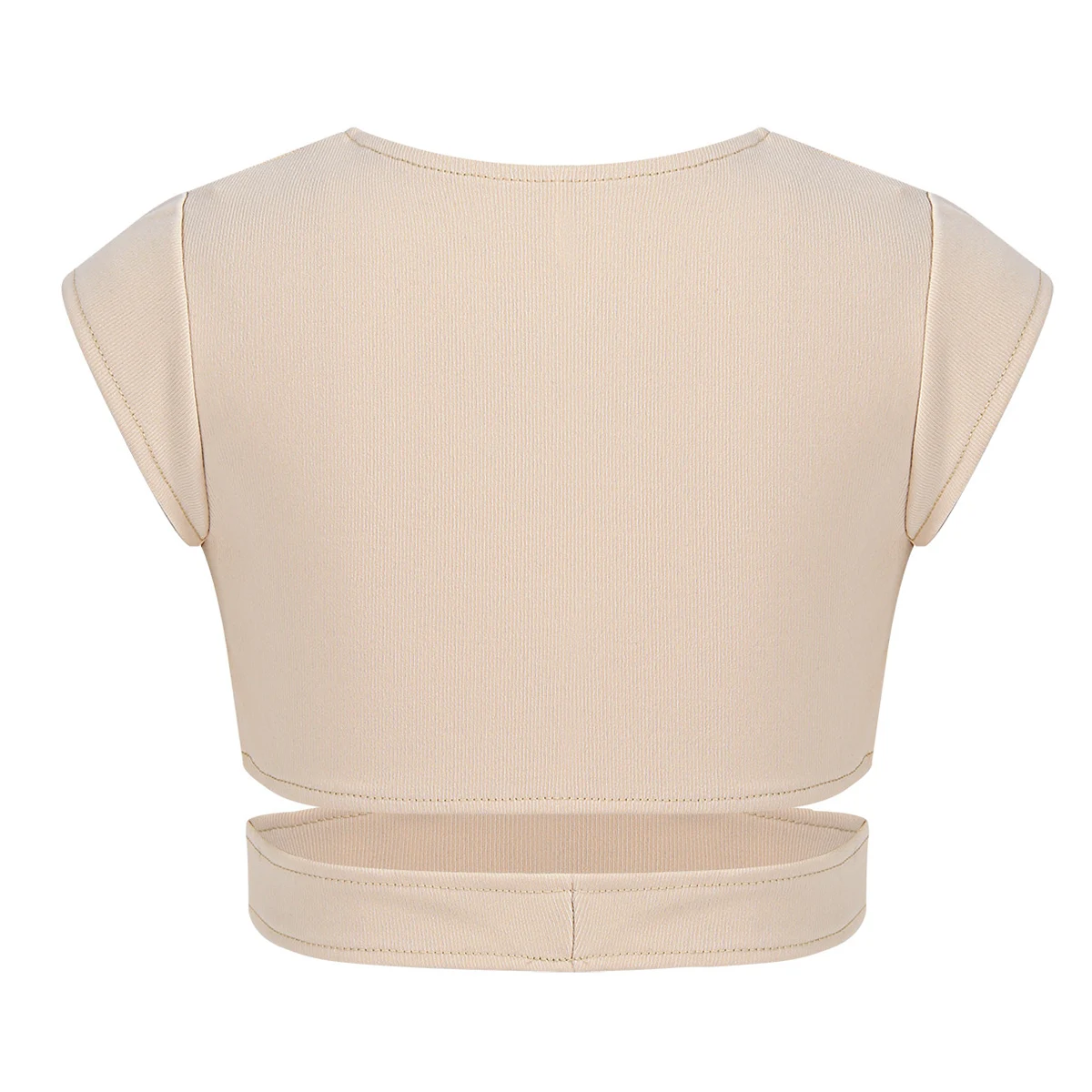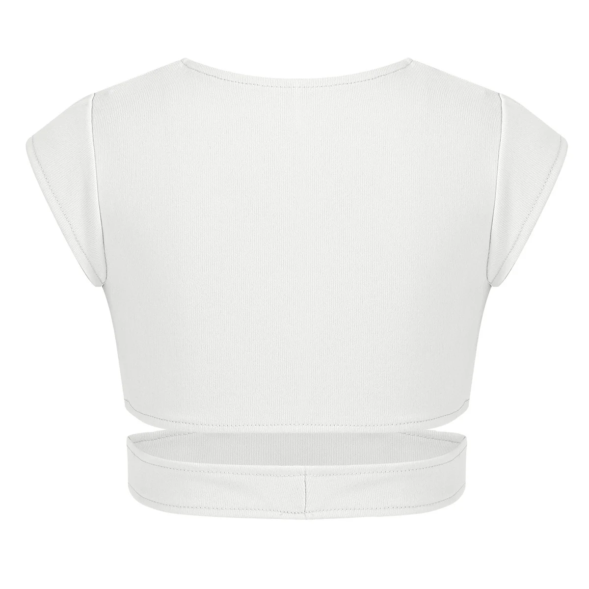 Детские танцевальные укороченные топы для девочек, эластичные майки с вырезом на талии и рукавами-крылышками, бюстгальтер, топы для балета, танцев, выступлений, тренировок